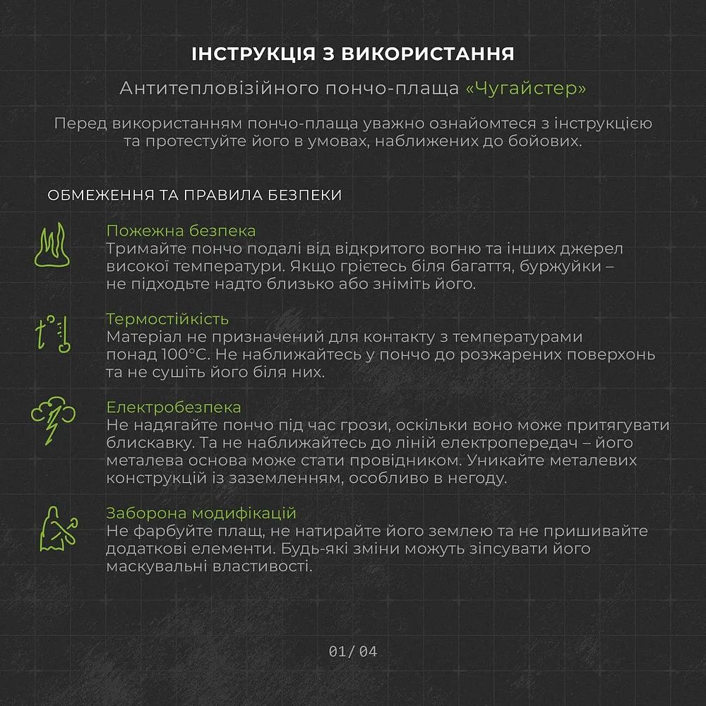 Пончо «Чугайстер» від Балістики створене для ефективного маскування військовослужбовця від тепловізійних приладів, прицілів і розвідувальних дронів. Завдяки інноваційній двосторонній тканині плащ знижує помітність теплової сигнатури людини та адаптує її до температурного фону довкілля.