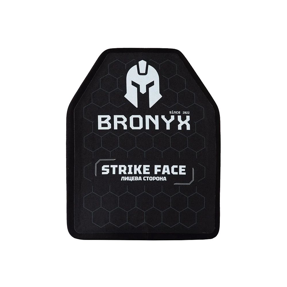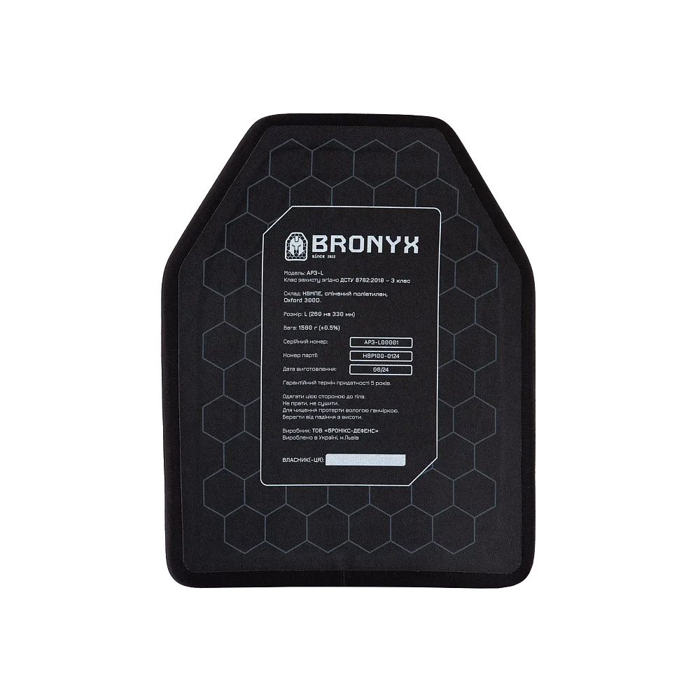 BRONYX бронеплита 3-го класу розмір L – є найлегшою плитою в лінійці жорстких бронеелементів Bronyx, належить до 3-го класу захисту згідно з ДСТУ 8782:2018. За результатами випробувань, проведених в сертифікованій лабораторії, дані бронеплити можуть захистити від куль 7Н6 (5.45 х 39 ПС) та 57-Н-231(7,62 х 39 ПС), а також від ураження уламками різної величини, шрапнелі та рикошетів.