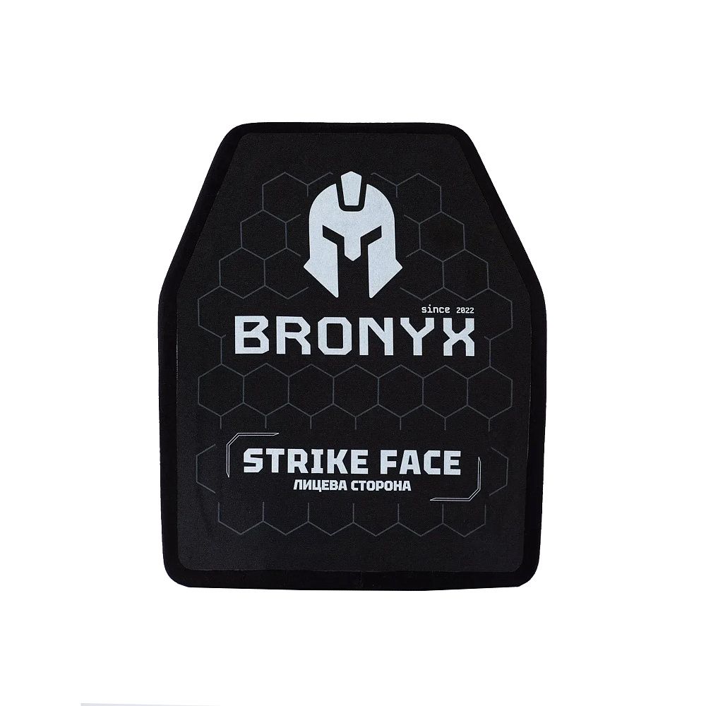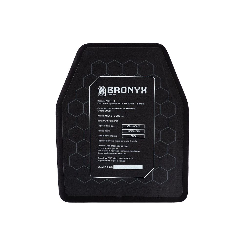 BRONYX бронеплита 3-го класу розмір M – є найлегшою плитою в лінійці жорстких бронеелементів Bronyx, належить до 3-го класу захисту згідно з ДСТУ 8782:2018. За результатами випробувань, проведених в сертифікованій лабораторії, дані бронеплити можуть захистити від куль 7Н6 (5.45 х 39 ПС) та 57-Н-231(7,62 х 39 ПС), а також від ураження уламками різної величини, шрапнелі та рикошетів.