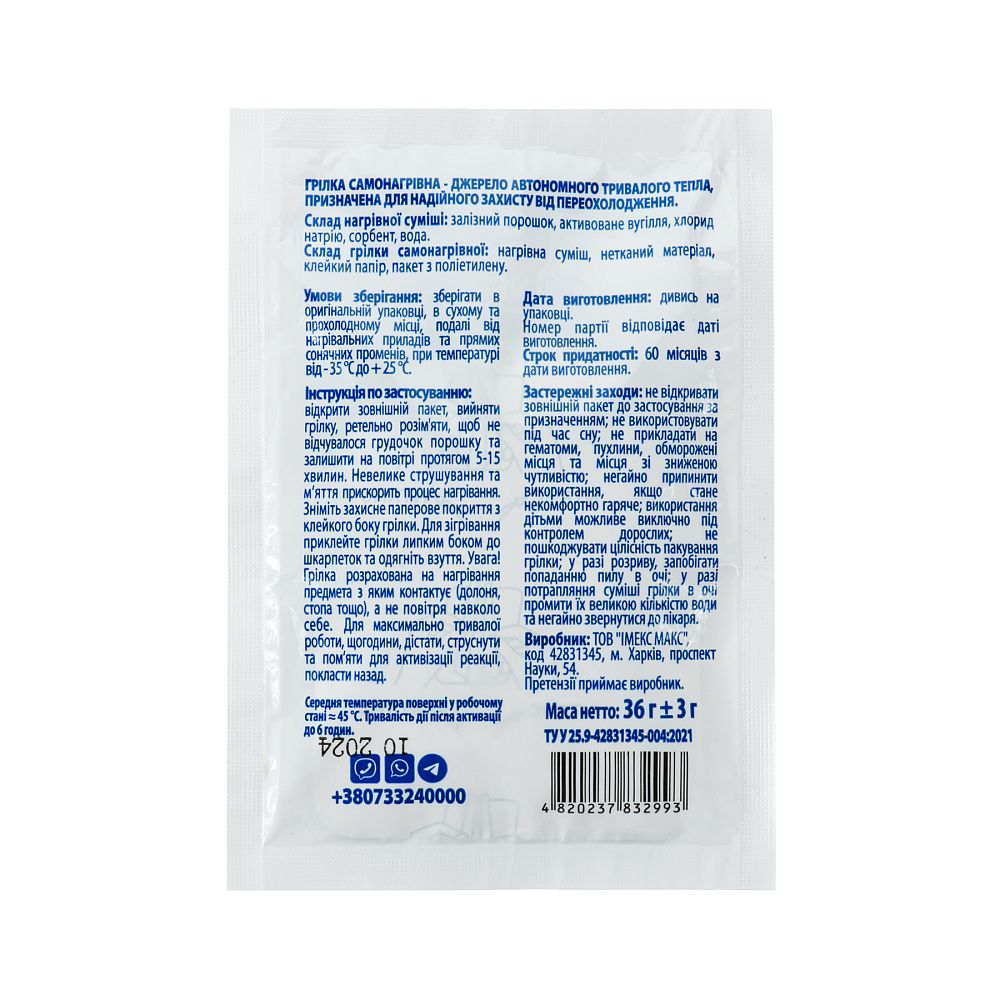 Увага! Грілка розрахована на нагрівання предмету з яким контактує (долоня, стопа тощо), а не повітря навколо себе. Для максимально тривалої роботи, щогодини, дістати, струсити та пом'яти для активації реакції, покласти назад.