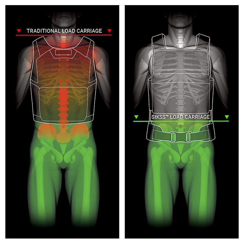 StKSS™ повністю ізолює плечі та хребет від навантаження, перерозподіляючи вагу на таз (тазові кістки) та ноги. Результат від використання системи та її переваги є очевидними для тих, хто знає, як тривале носіння бронежилета вагою 20+ кг впливає на нижню частину спини.