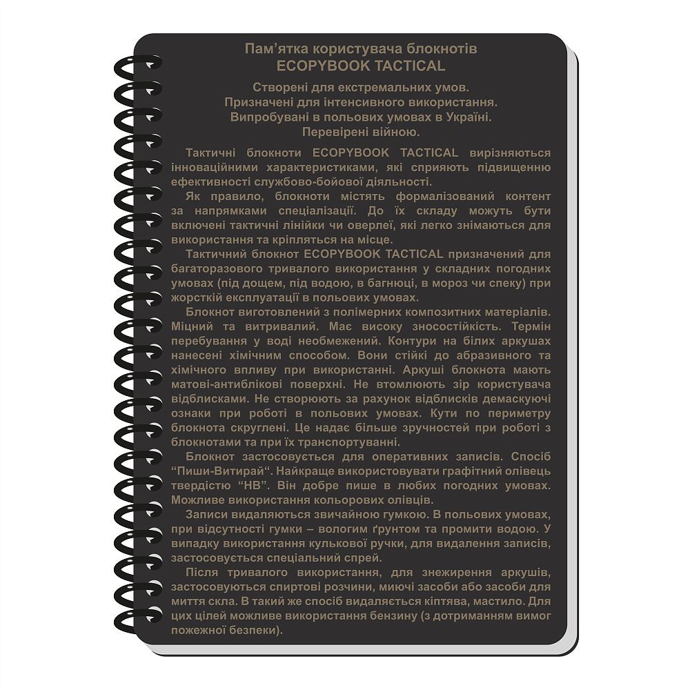 БЛОКНОТ КОМАНДИРА ВІДДІЛЕННЯ (РОЗШ.) від ECOPYBOOK TACTICAL призначений для багаторазового довгострокового використання під час складних погодних умов.