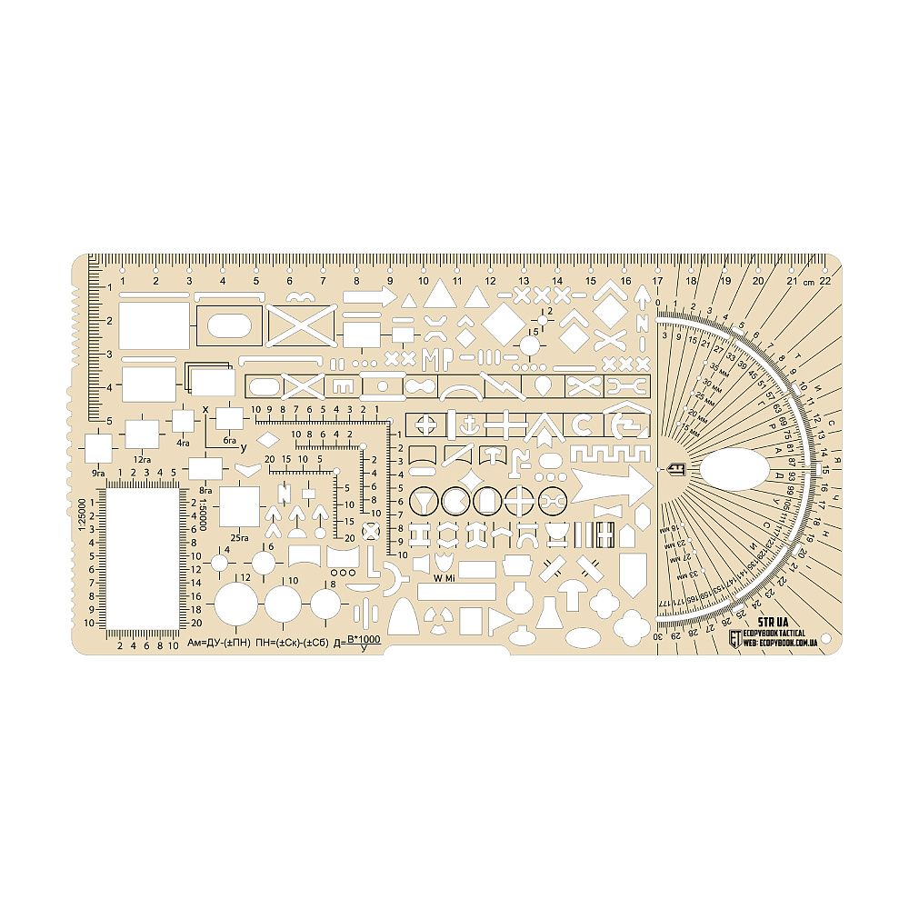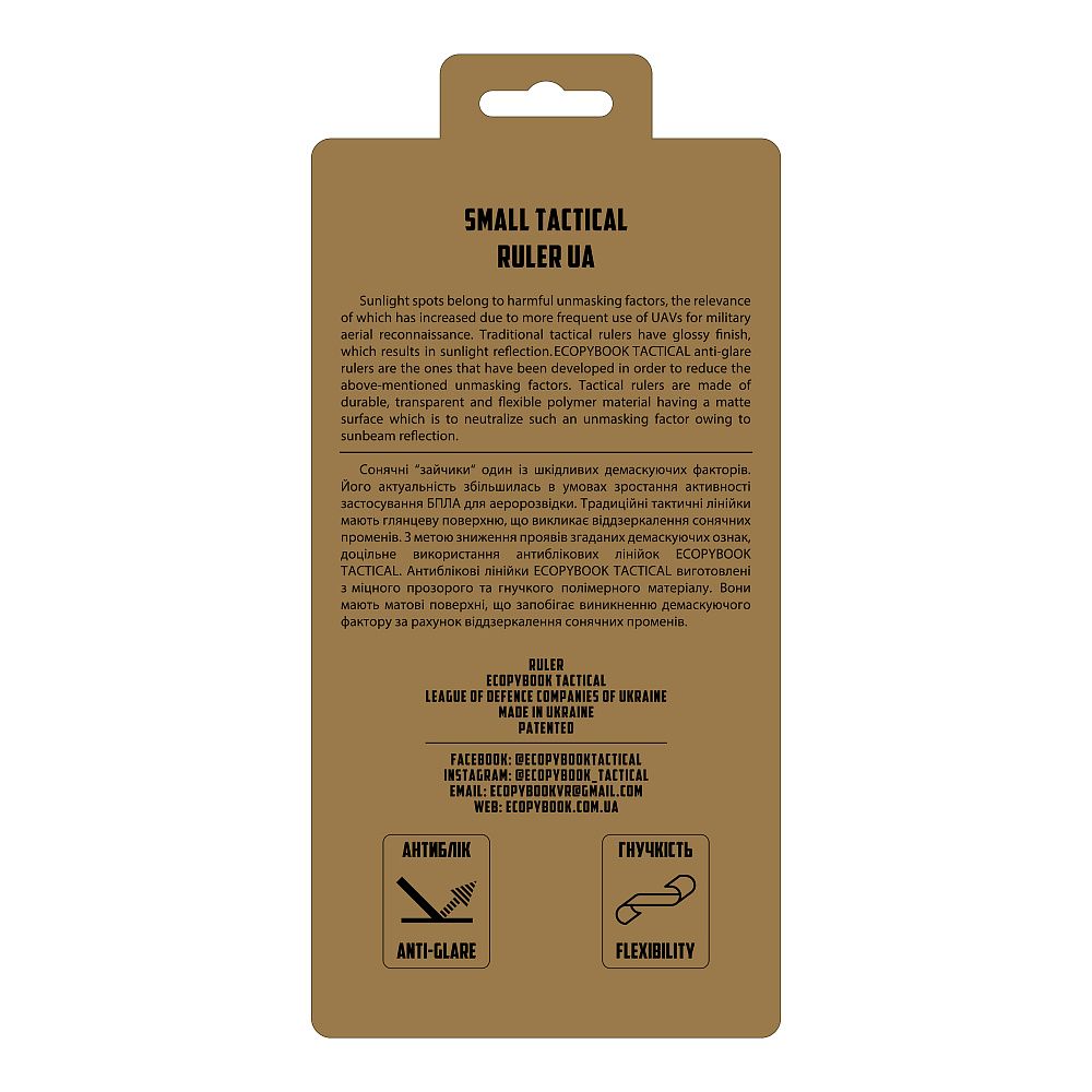 - Мала тактична лінійка розроблена та виготовлена спеціально для швидкого, зручного та легкого нанесення на карту основних умовних позначень у будь-яких умовах.