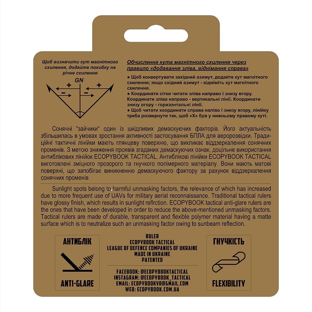 Тактичний антибліковий транспортир ECOPYBOOK був розроблений з метою зменшення вищезгаданого фактора демаскування. Тактичний транспортир виготовлений з міцного, прозорого та гнучкого полімерного матеріалу, що має матову поверхню, яка нейтралізує відбиття сонячних променів.