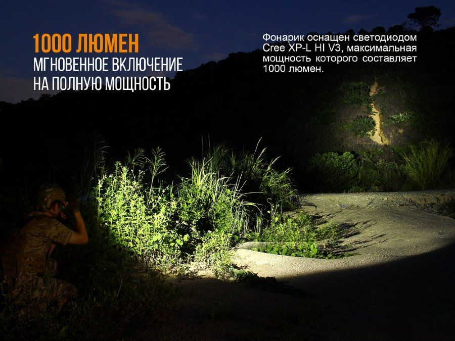 В фонаре Fenix PD35 V2.0 установлен современный светодиод американского производства Cree XP-L HI V3, который в свою очередь способен создавать луч света с яркостью до 1000 люмен и дальностью до 250 метров.