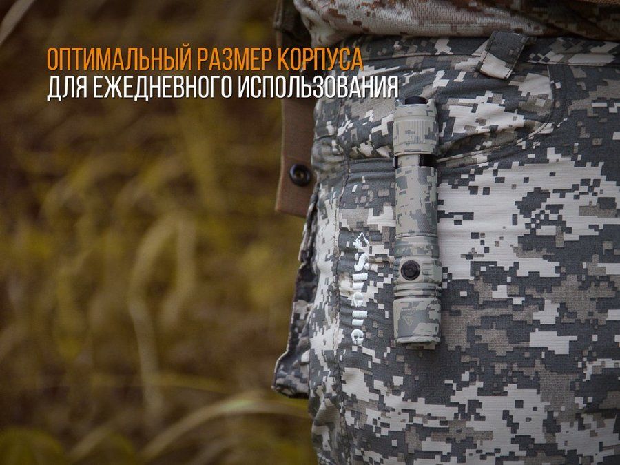Небольшие габариты фонаря и довольно плотное расположение комплектующих по отношению друг к другу никак не влияют на эффективность или длительность работы, ведь модель Fenix PD35 V2.0 имеет хорошо сбалансированную систему охлаждения и встроенный термоконтроллер, который в автоматическом режиме отслеживает температуру и понижает максимальный доступный уровень яркости при нагреве свыше 65°C.