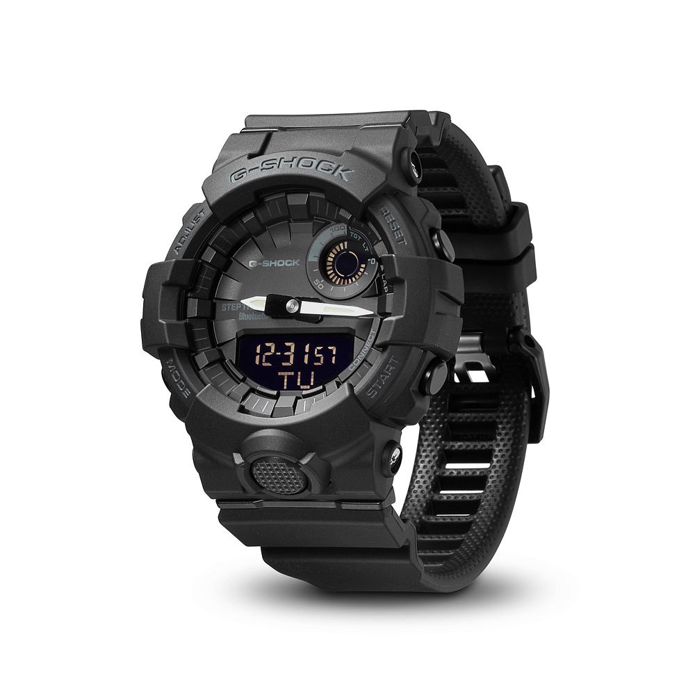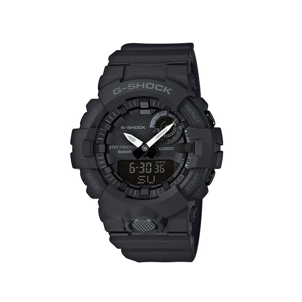 Японський годинник із колекції G-Shock створено для сильних чоловіків, які ведуть активний спосіб життя. Протиударна модель CASIO GBA-800-1AER виконана в спортивному стилі. Її особливості - водозахист 200 WR і міцне мінеральне скло. Полімерний ремінець легко регулюється на зап'ясті та міцно фіксує круглий чорний корпус із пластику.Завдяки світлодіодному підсвічуванню дисплей видно в темний час доби. На ньому є індикація дати, а також автоматичний календар, секундомір, таймер, п'ять будильників і крокомір. Поєднання аналогового і цифрового типів індикації та функція підтримки Bluetooth 4.0 припаде до душі спортсменам.
