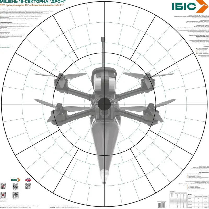 ІБІС МІШЕНЬ ДРОН (16 СЕКТОРІВ) – зображує дрон розміром 10". Діаметр зовнішнього кола – 75 см, внутрішнє коло – 37,5 см. Також присутні вказівки щодо перевірки бою дробової рушниці, оцінки ступеня згущення осипу шроту, рівномірності шротового осипу та різкості бою, приклад розрахунку купчастості та відповідні таблиці. Розмір мішені - 80х80 см.