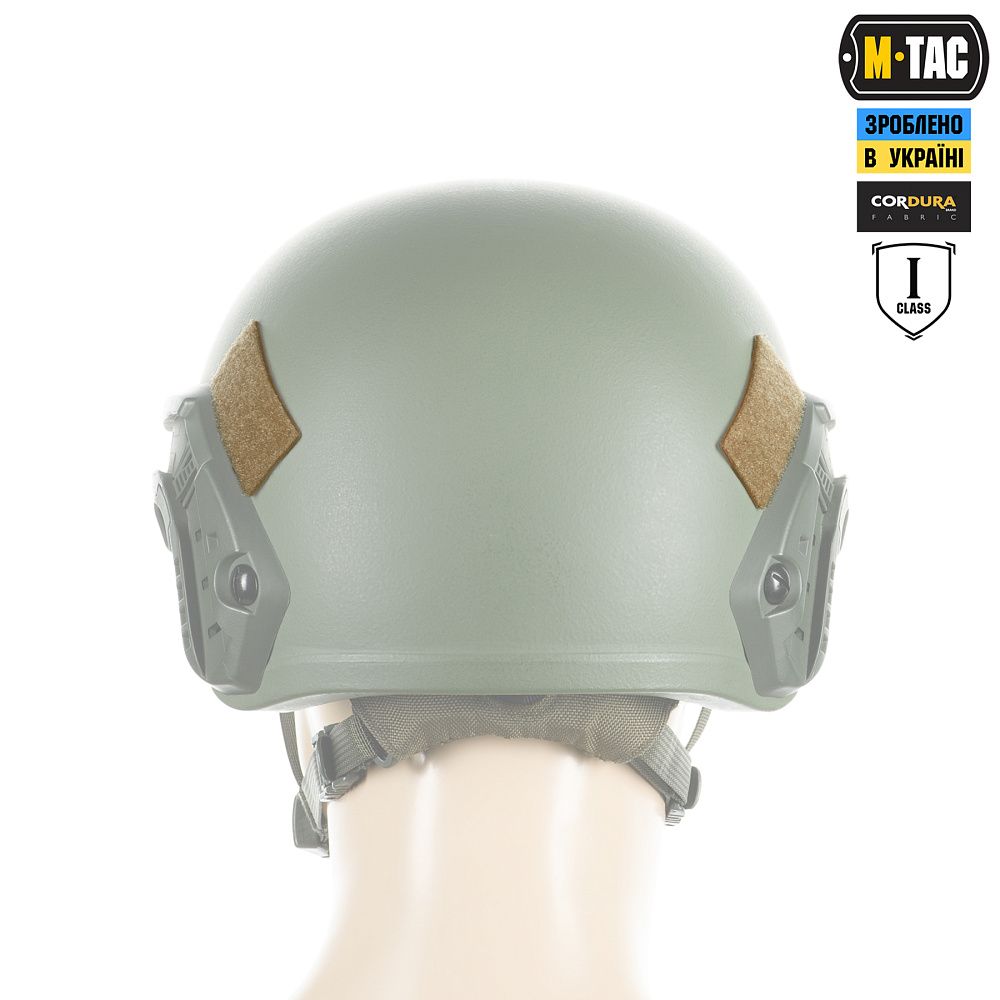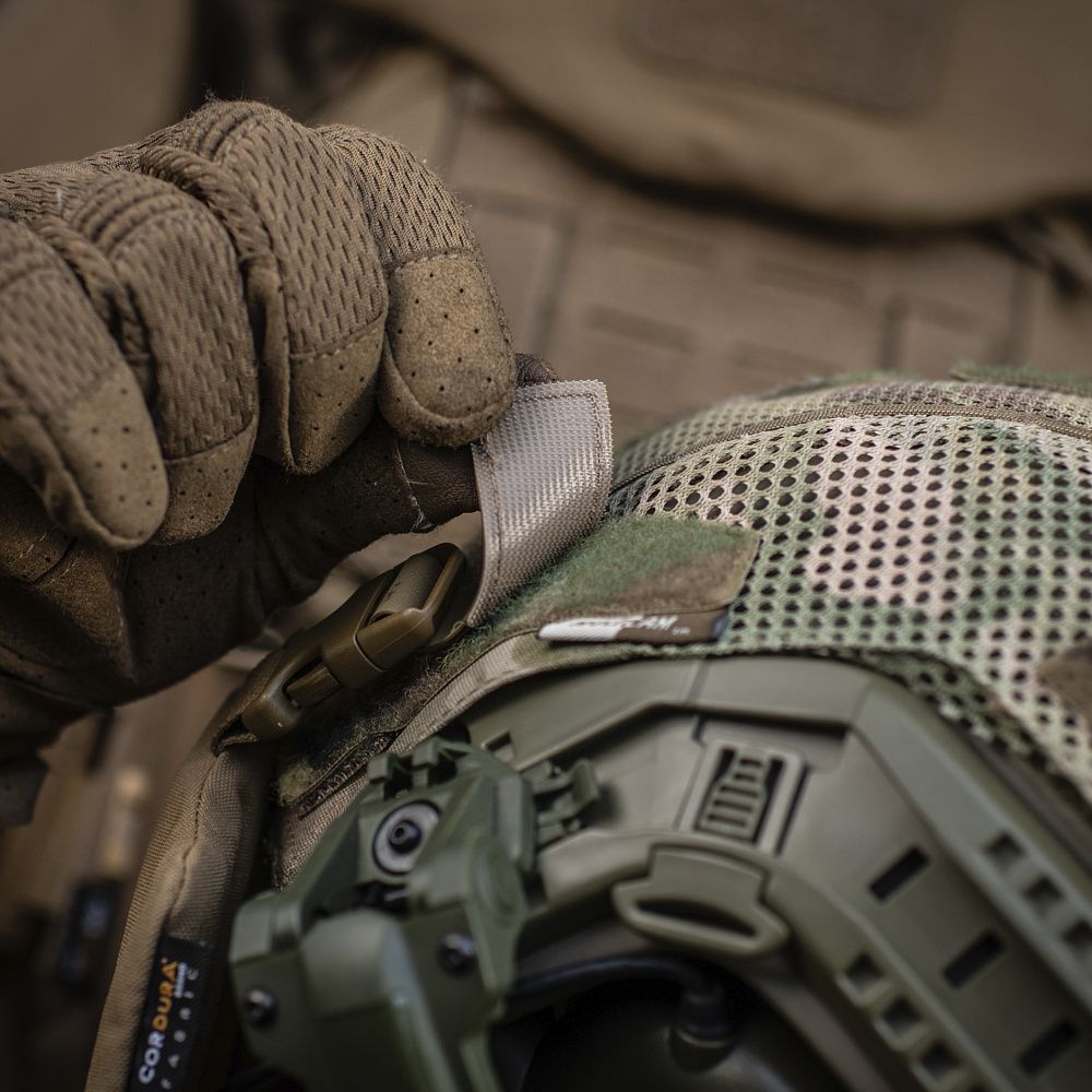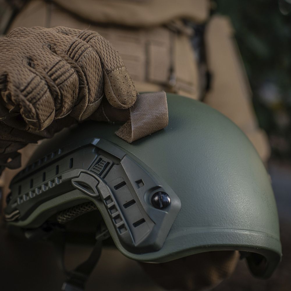 На верхній частині виробу знаходяться дві стропи з фастексами до яких прикріплені велкро-липучки. Нижня велкро-липучка оснащена двостороннім акриловим скотчем, за допомогою якого вона кріпиться до шолома. Даний вид акрилового скотчу забезпечує максимальну фіксацію, завдяки відсутності реакцій на різні типи розчинників, а також його стійкість до ультрафіолету та високих температур. Друга (верхня) частина велкро-липучки кріпиться до нижньої частини попередньо розміщеної на шоломі. Також, M-TАС БАЛІСТИЧНИЙ ЗАХИСТ ПОТИЛИЦІ З КРІПЛЕННЯМ НА ШОЛОМ 1 КЛАС ЗАХИСТУ можна прикріпити до каверу (за наявності на його задній частині велкро-панелі).