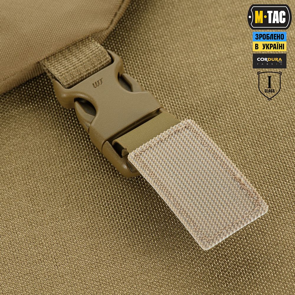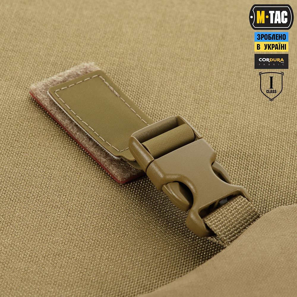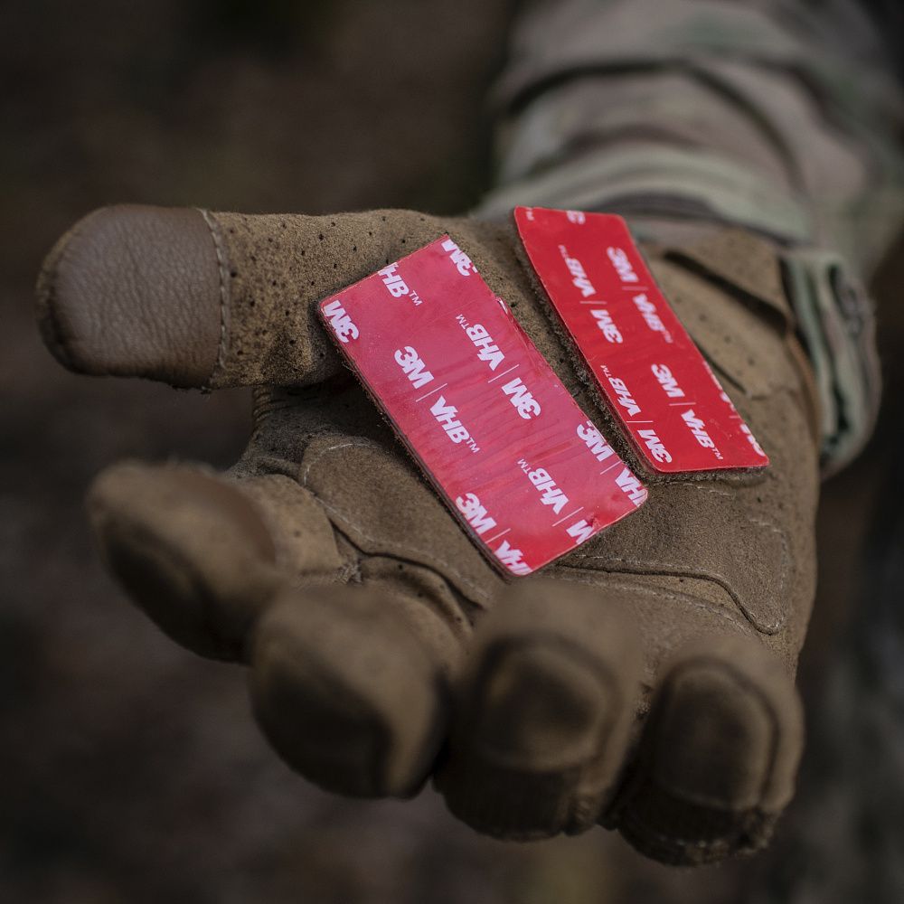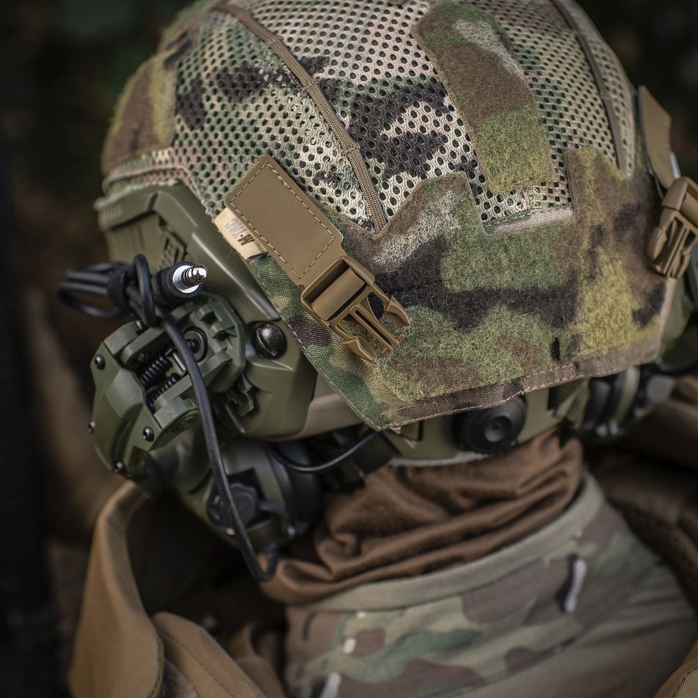 На верхній частині виробу знаходяться дві стропи з фастексами до яких прикріплені велкро-липучки. Нижня велкро-липучка оснащена двостороннім акриловим скотчем, за допомогою якого вона кріпиться до шолома. Даний вид акрилового скотчу забезпечує максимальну фіксацію, завдяки відсутності реакцій на різні типи розчинників, а також його стійкість до ультрафіолету та високих температур. Друга (верхня) частина велкро-липучки кріпиться до нижньої частини попередньо розміщеної на шоломі. Також, M-TАС БАЛІСТИЧНИЙ ЗАХИСТ ПОТИЛИЦІ З КРІПЛЕННЯМ НА ШОЛОМ 1 КЛАС ЗАХИСТУ можна прикріпити до каверу (за наявності на його задній частині велкро-панелі).