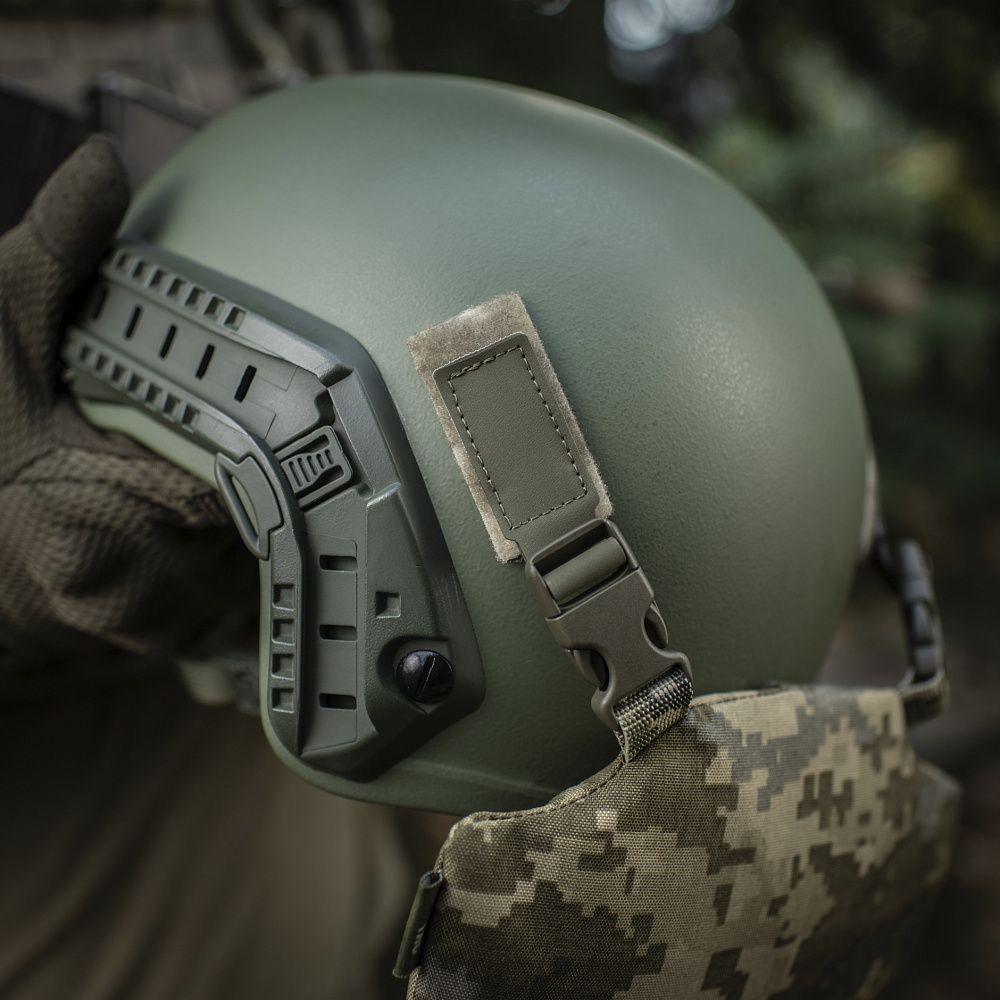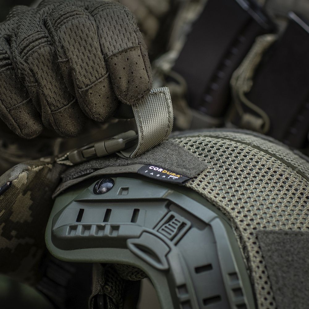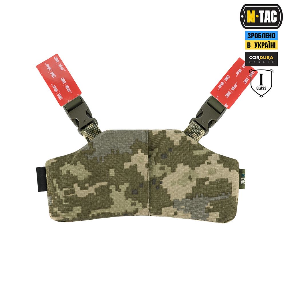 На верхній частині виробу знаходяться дві стропи з фастексами до яких прикріплені велкро-липучки. Нижня велкро-липучка оснащена двостороннім акриловим скотчем, за допомогою якого вона кріпиться до шолома. Даний вид акрилового скотчу забезпечує максимальну фіксацію, завдяки відсутності реакцій на різні типи розчинників, а також його стійкість до ультрафіолету та високих температур. Друга (верхня) частина велкро-липучки кріпиться до нижньої частини попередньо розміщеної на шоломі. Також, M-TАС БАЛІСТИЧНИЙ ЗАХИСТ ПОТИЛИЦІ З КРІПЛЕННЯМ НА ШОЛОМ 1 КЛАС ЗАХИСТУ можна прикріпити до каверу (за наявності на його задній частині велкро-панелі).