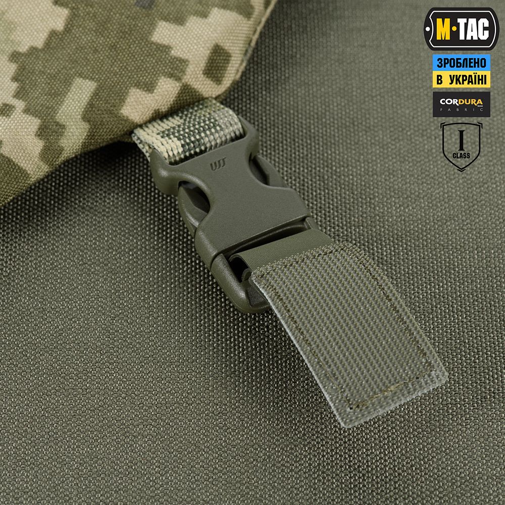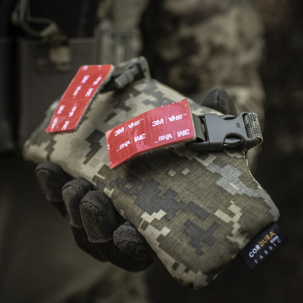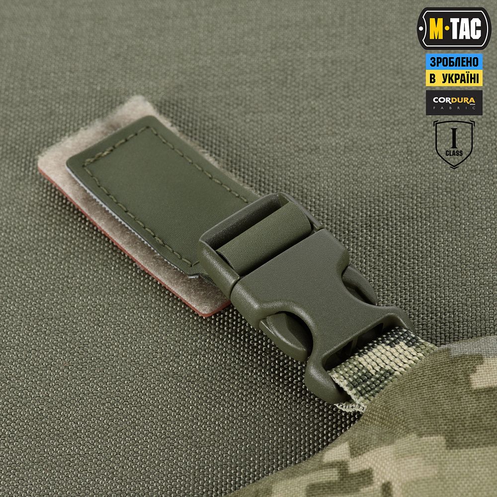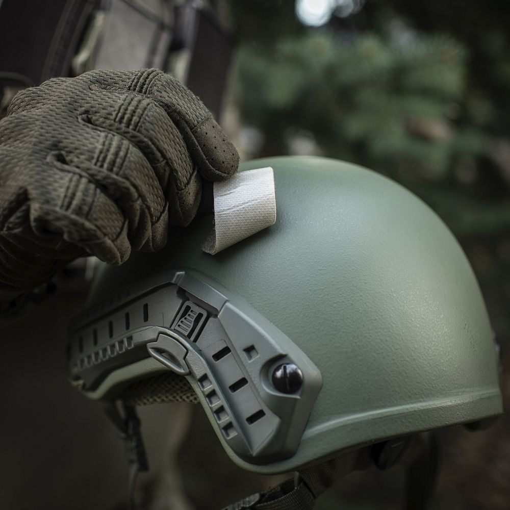 На верхній частині виробу знаходяться дві стропи з фастексами до яких прикріплені велкро-липучки. Нижня велкро-липучка оснащена двостороннім акриловим скотчем, за допомогою якого вона кріпиться до шолома. Даний вид акрилового скотчу забезпечує максимальну фіксацію, завдяки відсутності реакцій на різні типи розчинників, а також його стійкість до ультрафіолету та високих температур. Друга (верхня) частина велкро-липучки кріпиться до нижньої частини попередньо розміщеної на шоломі. Також, M-TАС БАЛІСТИЧНИЙ ЗАХИСТ ПОТИЛИЦІ З КРІПЛЕННЯМ НА ШОЛОМ 1 КЛАС ЗАХИСТУ можна прикріпити до каверу (за наявності на його задній частині велкро-панелі).
