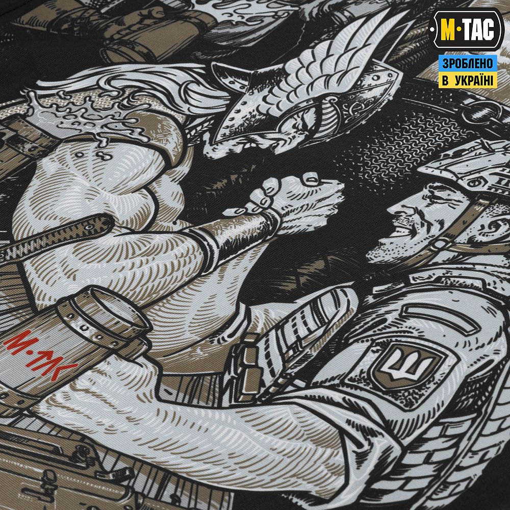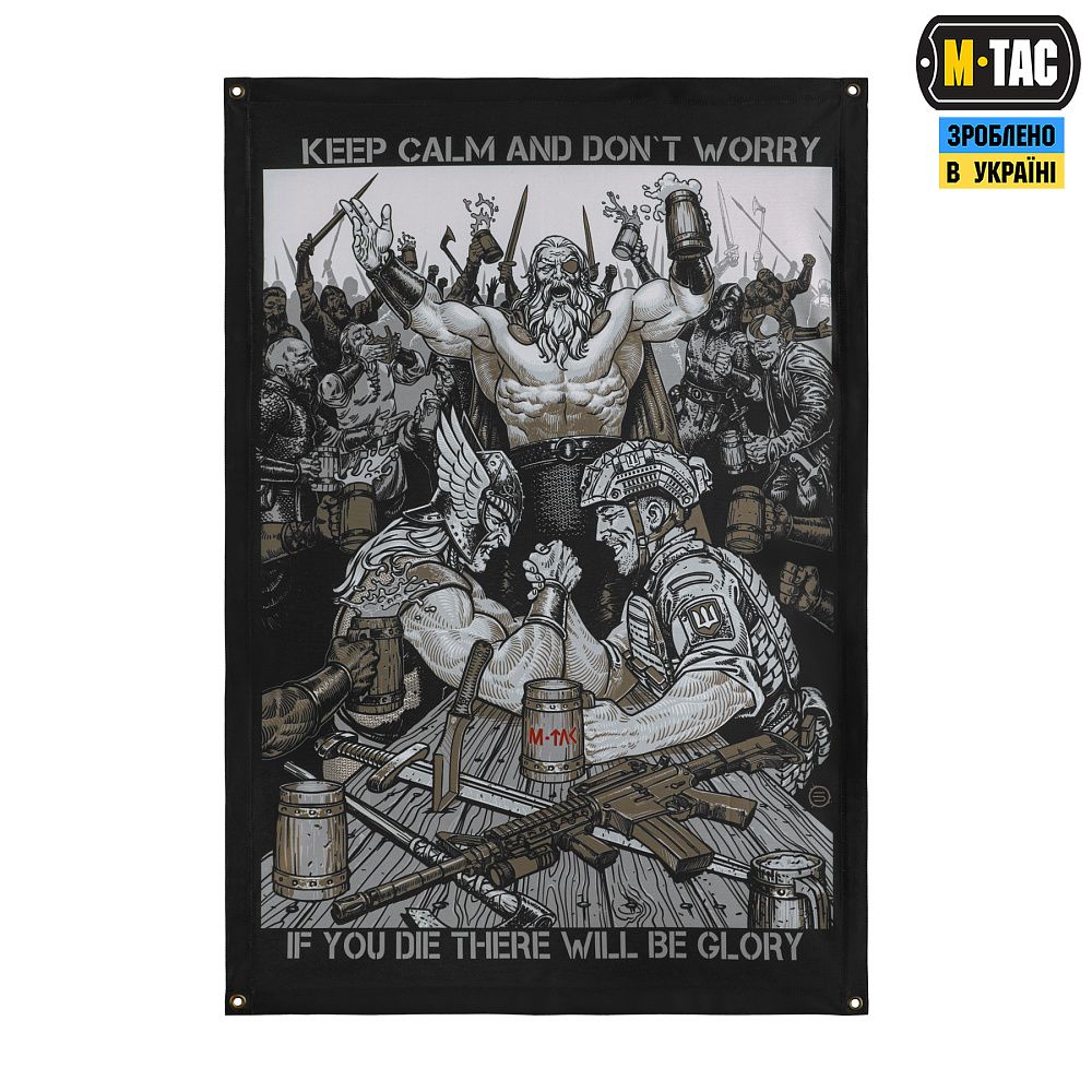 На банері зображено сюжет, на якому український захисник потрапляє в Валгаллу. Там з одним із стародавніх воїнів, він зійшовся в дуелі з армреслінгу, а час до початку поєдинку для них відраховує сам Одін. Написи на принті “KEEP CALM AND DON'T WORRY” та “IF YOU DIE THERE WILL BE GLORY” символізують славу для кожного захисника рідної землі, навіть після смерті.