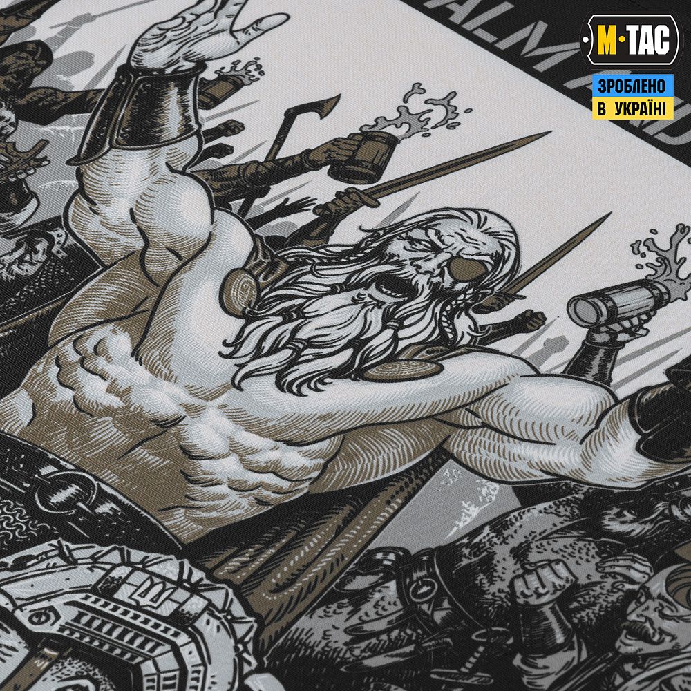 На банері зображено сюжет, на якому український захисник потрапляє в Валгаллу. Там з одним із стародавніх воїнів, він зійшовся в дуелі з армреслінгу, а час до початку поєдинку для них відраховує сам Одін. Написи на принті “KEEP CALM AND DON'T WORRY” та “IF YOU DIE THERE WILL BE GLORY” символізують славу для кожного захисника рідної землі, навіть після смерті.