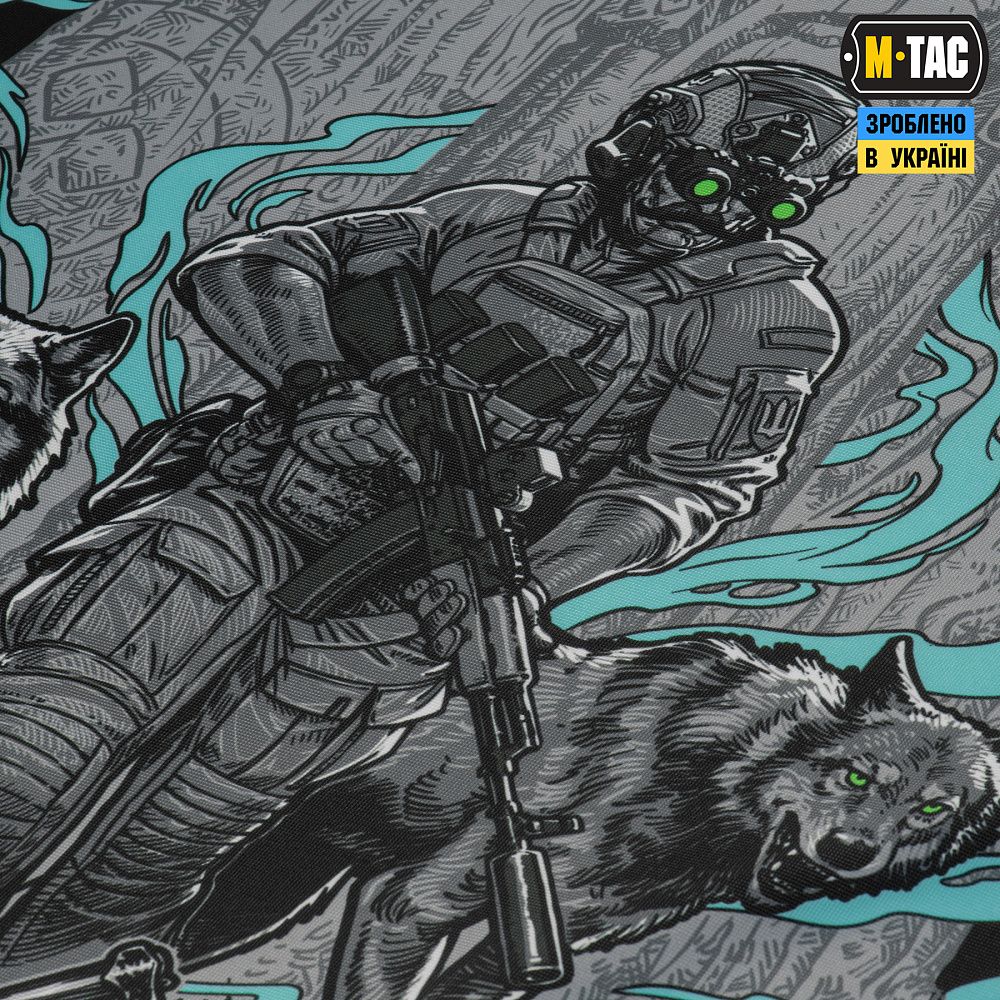 На принті зображений сучасний військовий. Він є символом мужності та відважності Сили оборони України. Поруч з ним його вірні побратими: сова, що віддавна вважається уособленням мудрості, а на сьогодні - символом військової розвідки, та вовки - втілення вірності, сили та відваги, а також уособлення ССО. Разом - вони є символом мужніх та непохитних воїнів, які день з днем, пліч-о-пліч, виборюють наше право на незалежність. Позаду них зображені фігури старовинних богів, що уособлюють вихід військової звитяги українців з сивої давнини.