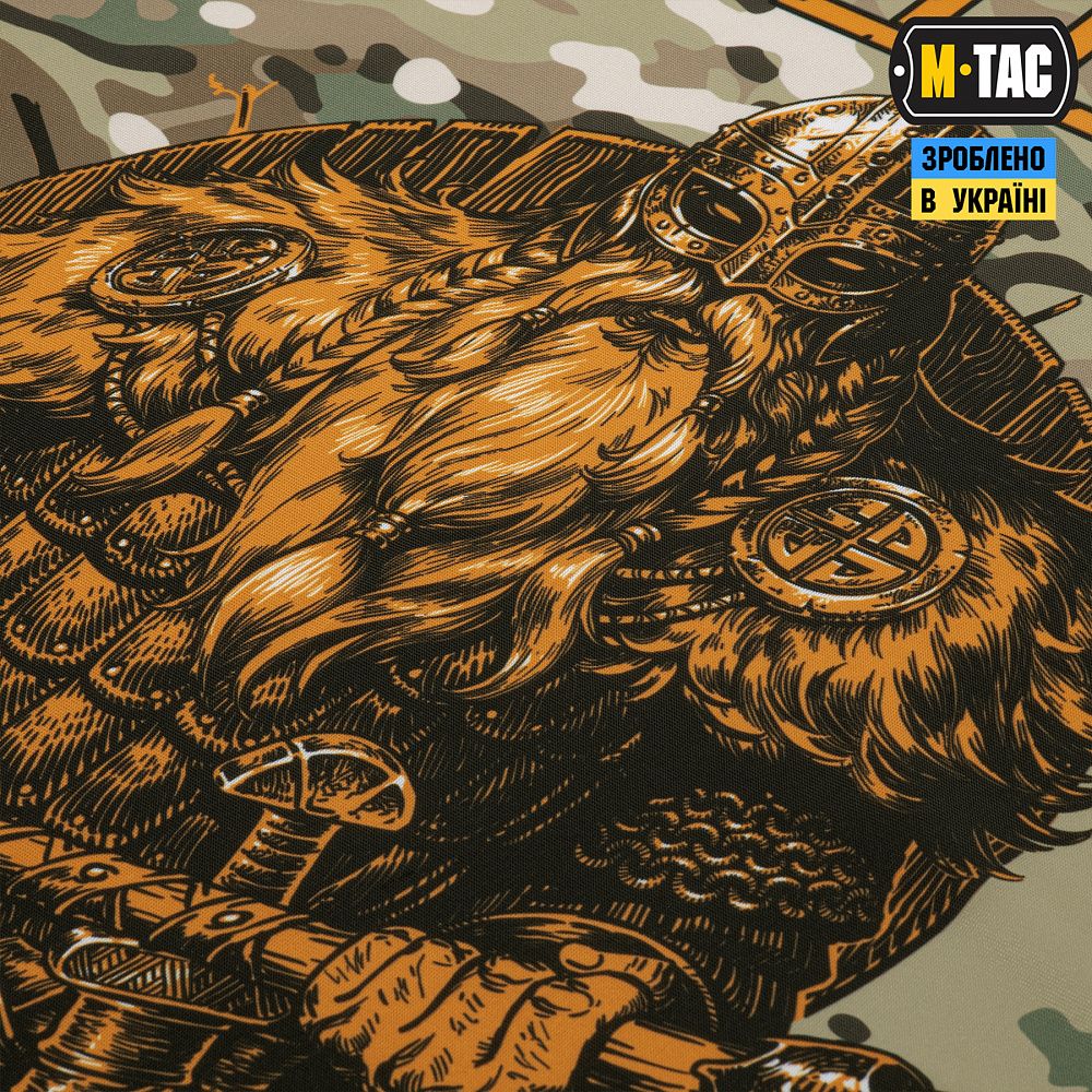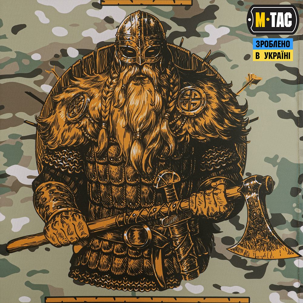 На банері зображений грізний вікінг в амуніції та з сокирою в руках. На принті розміщений напис "Til Valhall" – стародавній клич скандинавських воїнів перед боєм. Це нагадування про цінності, з якими йшли у бій воїни-скандинави, їхнє прагнення стояти до кінця та почесна місія – померти, виконуючи свій обов'язок.