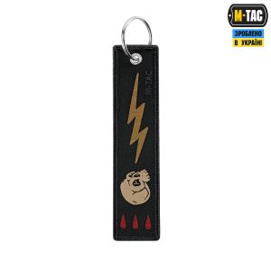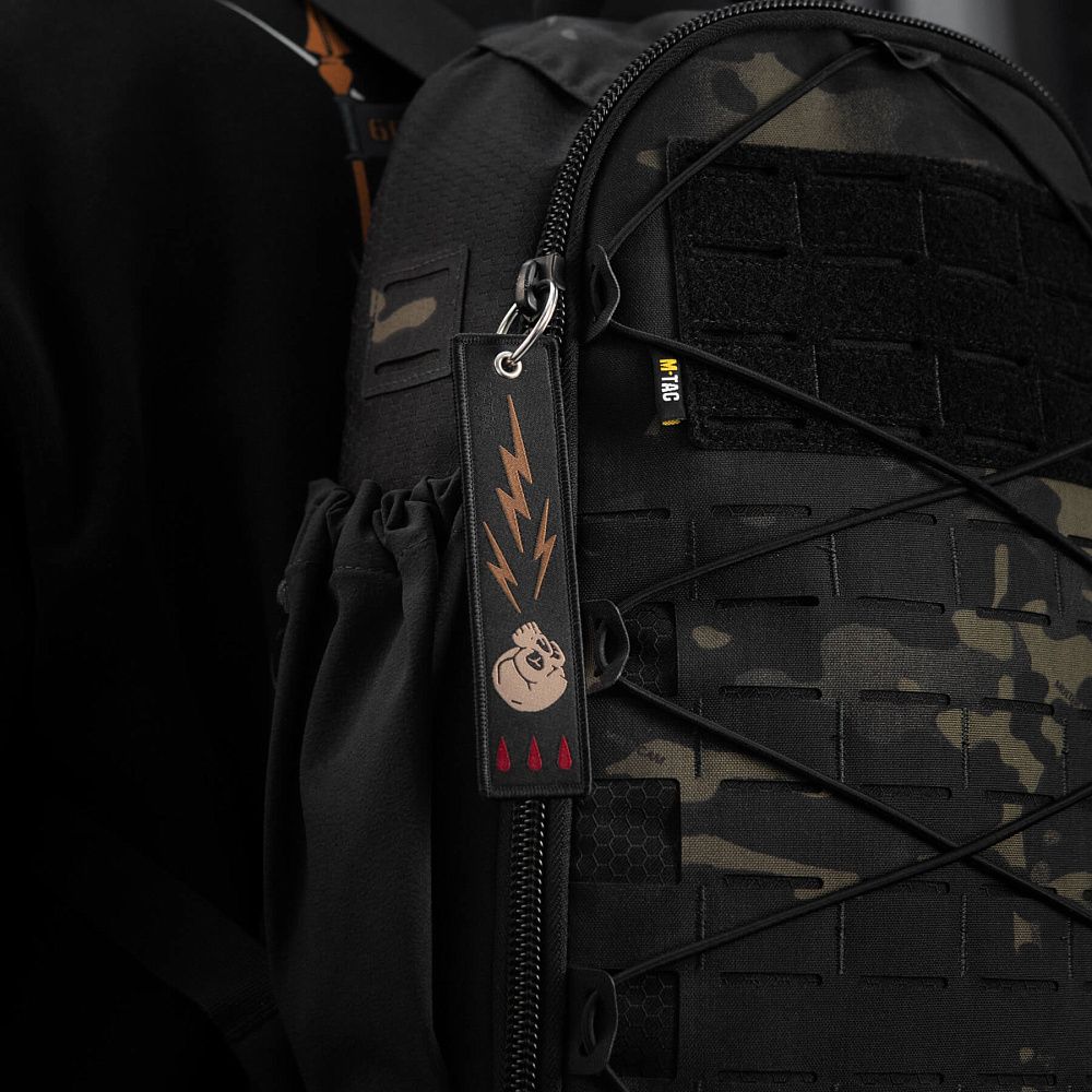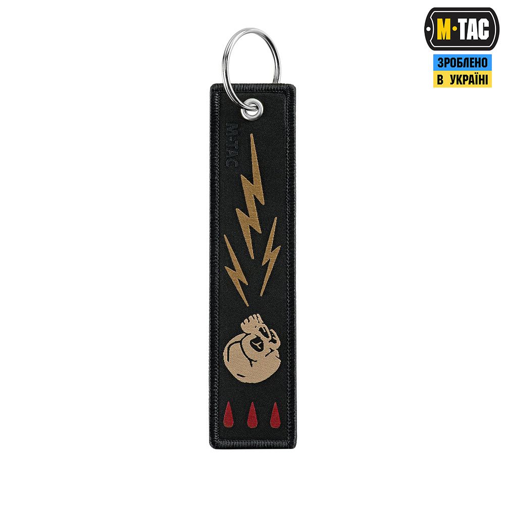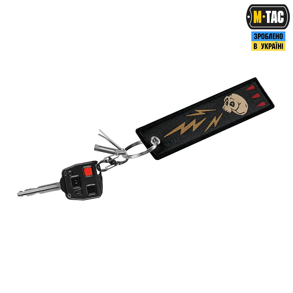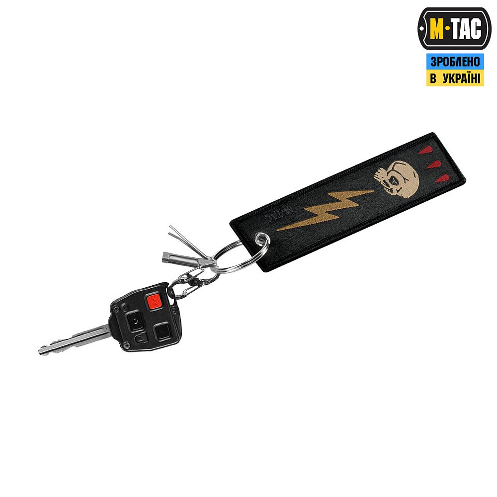 На М-Тас брелоку Блискавка зображений череп ворога, який вражає блискавка. Він зручно кріпиться до ключів, сумки, рюкзака тощо за допомогою металевого кільця.