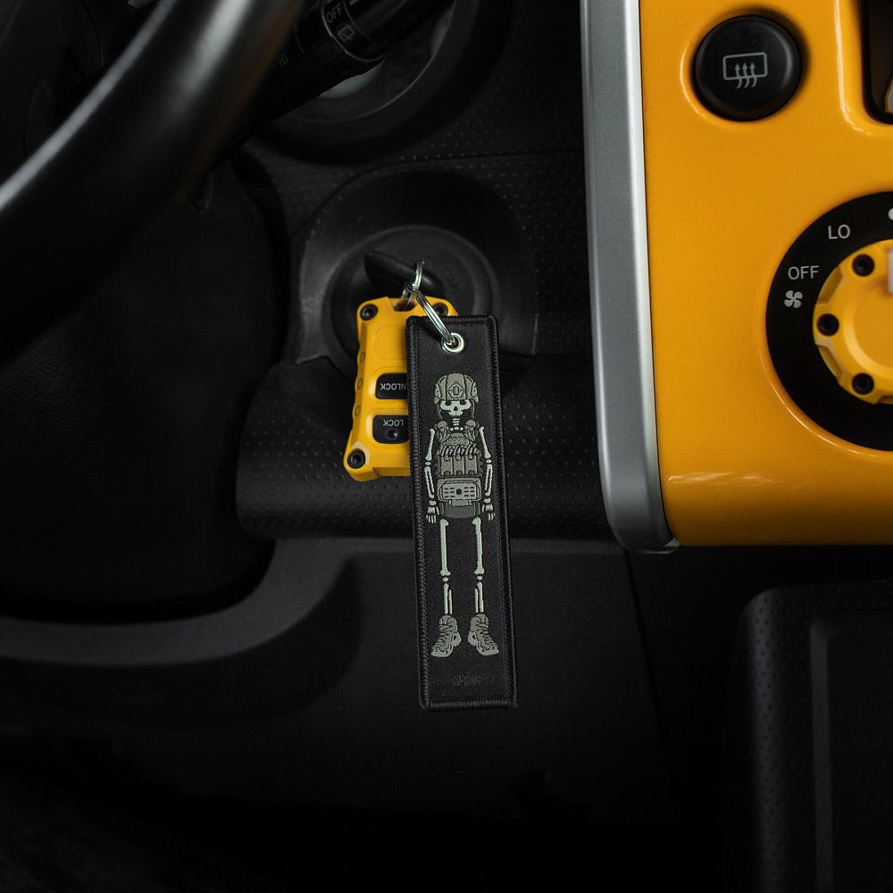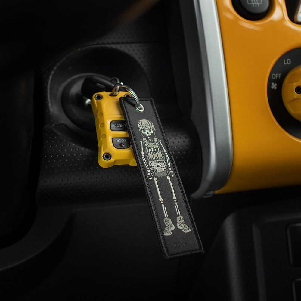 Серед усього розмаїття брелоків культовим став “Remove Before Flight” – елемент, що прийшов до нас з авіації та швидко здобув популярність. Яскраво-червоні стрічки з таким написом використовувалися на літаках як попереджувальні маркери, які необхідно було зняти перед вильотом. Згодом, зменшена версія цієї сигнальної стрічки перетворилася на впізнаваний аксесуар.