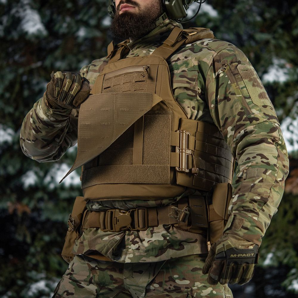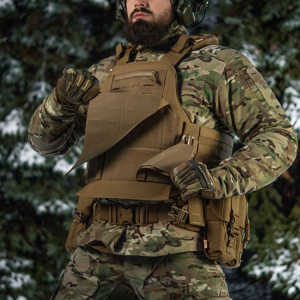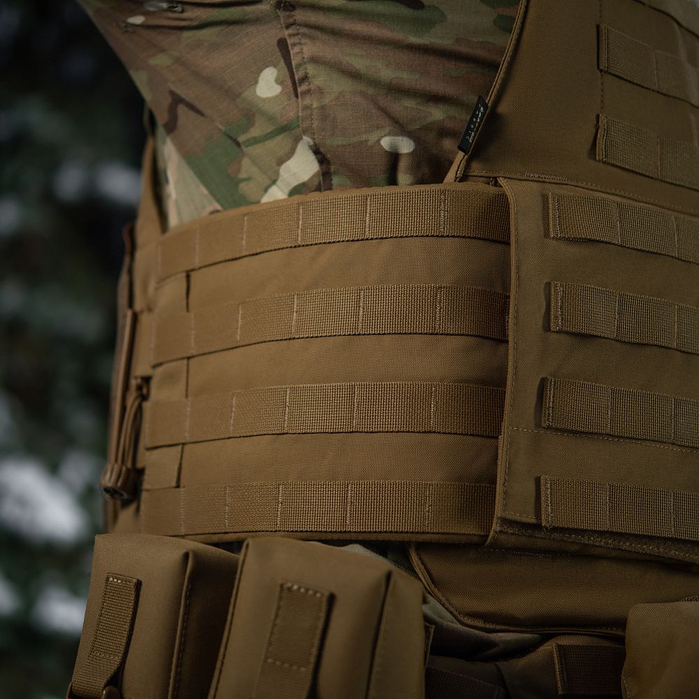 Чохол бронежилета виготовлений з високоякісного матеріалу Cordura 500D – надміцної тканини, стійкої до стирання і високих навантажень. Розширений камербанд з Molle інтерфейсом на 4 стропи при необхідності дозволяє розмістити додаткове спорядження, наприклад, горизонтальні аптечки або утилітарні підсумки.