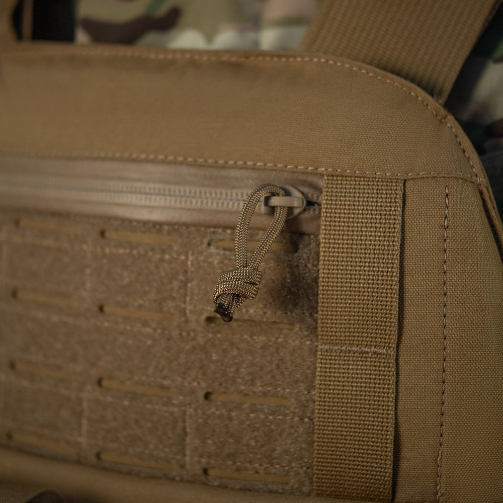 Зверху чохла бронежилета – невелика адміністративна кишеня, яка закривається на вологозахисну блискавку AquaGuard та підійде для зберігання посвідчення, картки, дозволу на зброю та інших подібних за розміром предметів. Велкро панель з прорізами дозволить прикріпити як ваші улюблені патчі, так й інше Molle-сумісне спорядження.