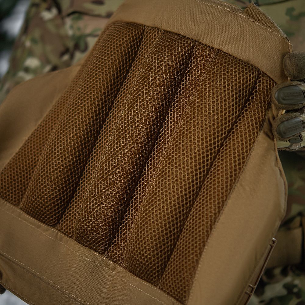 На задній панелі виробу – класичний MOLLE-інтерфейс, у верхній частині якого розташована евакуаційна стропа, яка з рекомендацій військових була посилена спеціальними закріпками. З внутрішньої сторони по всій площині грудного та спинного відділів дизайнери бренду передбачили вставки з 3D сітки та спеціальні демпферні пади, що забезпечують відмінну циркуляцію повітря.