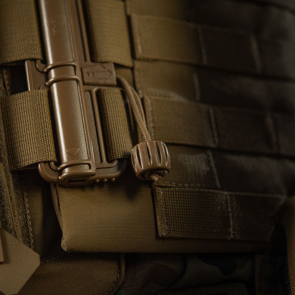Основною особливістю M-TAC ЧОХОЛ БРОНЕЖИЛЕТА STURM GEN.II ELITE та її головною відмінністю від попередніх генерацій - є фастекси швидкого скидання з фурнітури Duraflex, які розміщені на камербанді. Дані фастекси відносяться до класу преміум, завдяки поєднанню спрощеної системи застібання (розстібання), невеликої ваги та міцності (витримують високі навантаження). Для того, щоб застібнути фастекс, варто помістити частину, прикріплену до камербанду, в пас фастексу на передній частині плитоноски та провести до характерного звуку. Для того, щоб його роз’єднати, необхідно різко потягнути вверх/низ.