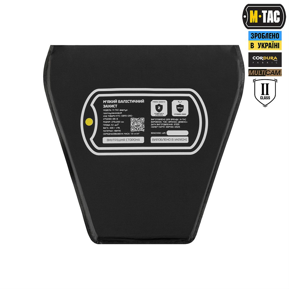 М’який балістичний пакет виготовлений з надвисокомолекулярного поліетилену та відповідає STANAG 2920 з показником протиуламкової стійкості V-50 близько 700+ м/с.