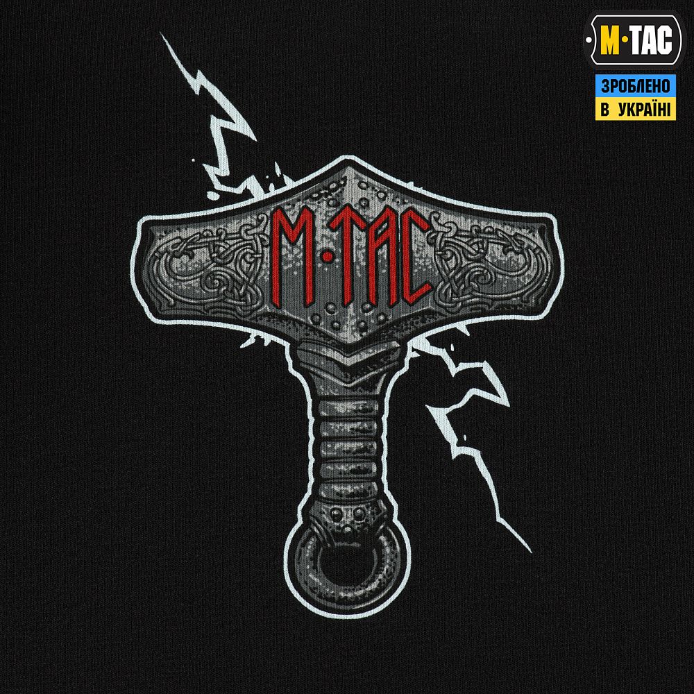 Молот Мйольнір, який Тор тримає в руках, за легендами був здатен знищити практично будь-яку загрозу, так само як і сучасне артилерійське озброєння, також зображене на принті. Низ футболки прикрашений емблемою Ракетних військ і артилерії – символом мужніх й безстрашних оборонців української землі.