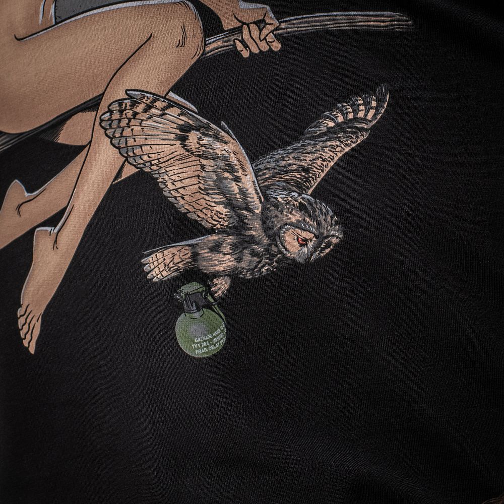 На принті зображена одна з найвідоміших представниць українського фольклору - відьма. Вона змінила свою звичну розвагу, зваблення чоловіків, на дещо більш корисне - ліквідацію окупантів. Поруч із нею, зображений смертоносний рій українських залізних пташок, а також сова, що віддавна вважається уособленням мудрості, а на сьогодні - символом військової розвідки. Тож, заручившись підтримкою природи та новітніх технологій, українська бешкетниця готова подарувати окупантам поцілунок смерті, а також нагадати, що їхня доля - лише в її руках.
