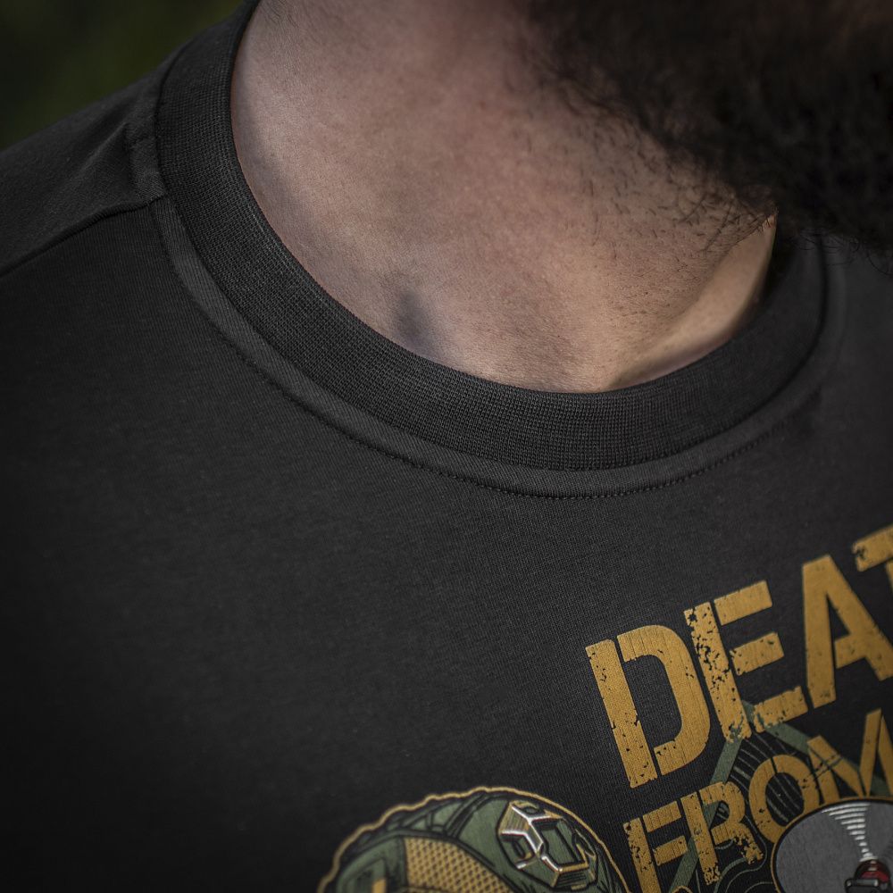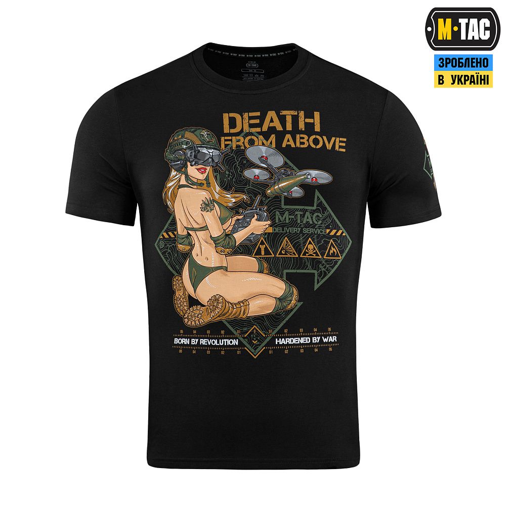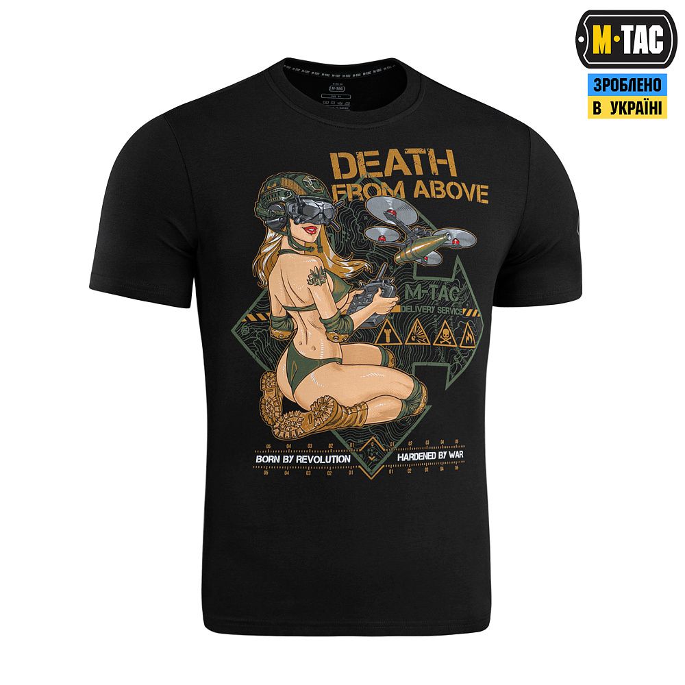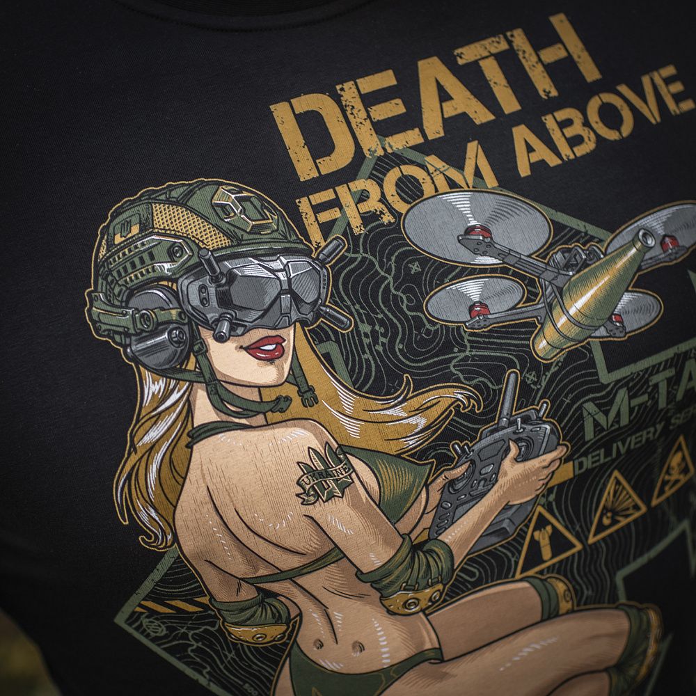 На принті зображена кокетлива й надзвичайно приваблива дівчина в стилі Pin-Up, що випромінює красу та силу характеру. Вона впевнена та сильна, спокуслива й рішуче налаштована на знищення ворогів. Красуня в спеціальних окулярах майстерно управляє FPV дроном, який несе полум'яний "привіт" окупантам з неба. Зверху принта розміщений напис "Death from Above", натякаючи на те, що ворогові не вдасться сховатись від маленького, прудкого та смертельно небезпечного "поштового голуба".