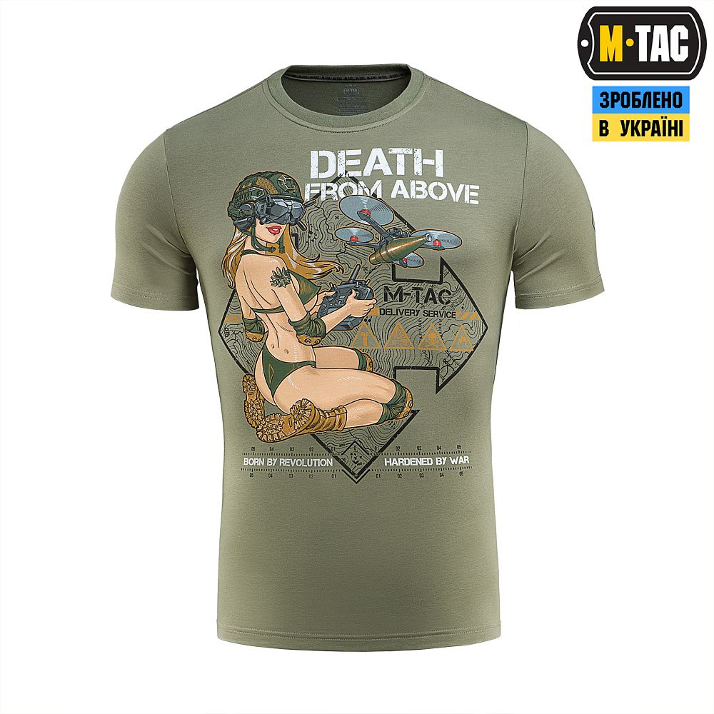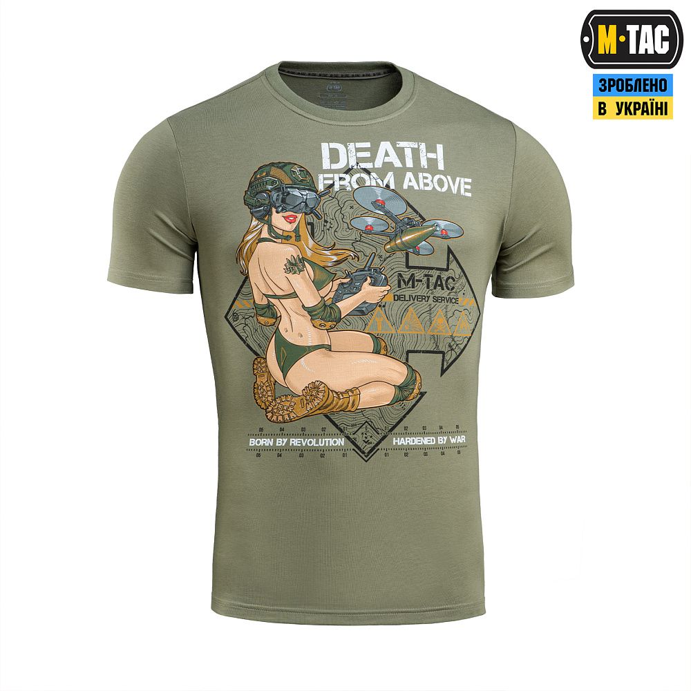 На принті зображена кокетлива й надзвичайно приваблива дівчина в стилі Pin-Up, що випромінює красу та силу характеру. Вона впевнена та сильна, спокуслива й рішуче налаштована на знищення ворогів. Красуня в спеціальних окулярах майстерно управляє FPV дроном, який несе полум'яний "привіт" окупантам з неба. Зверху принта розміщений напис "Death from Above", натякаючи на те, що ворогові не вдасться сховатись від маленького, прудкого та смертельно небезпечного "поштового голуба".