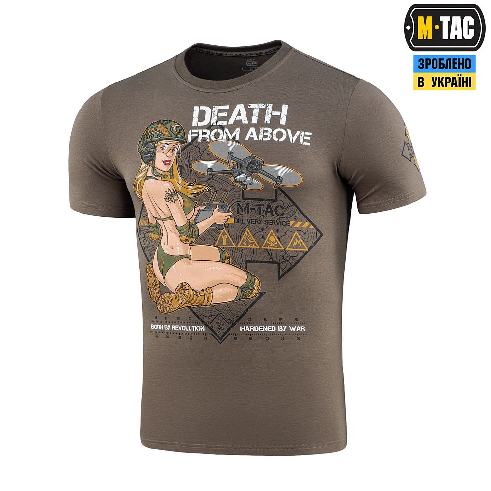 На принті зображена кокетлива й надзвичайно приваблива дівчина в стилі Pin-Up, що випромінює красу та силу характеру. Вона впевнена та сильна, спокуслива й рішуче налаштована на знищення ворогів. Красуня в спеціальних окулярах майстерно управляє FPV дроном, який несе полум'яний "привіт" окупантам з неба. Зверху принта розміщений напис "Death from Above", натякаючи на те, що ворогові не вдасться сховатись від маленького, прудкого та смертельно небезпечного "поштового голуба".