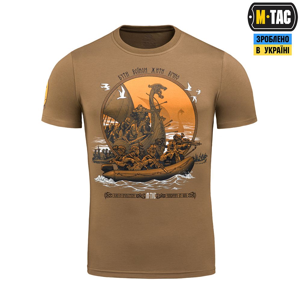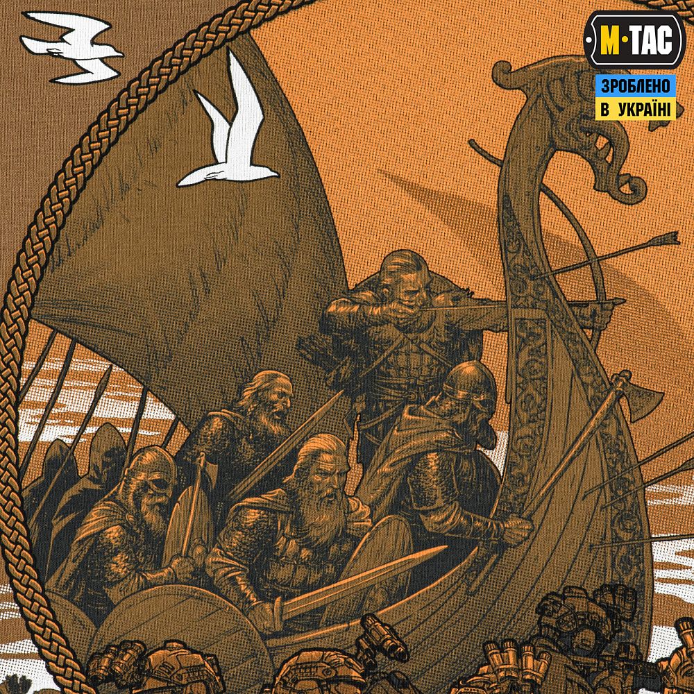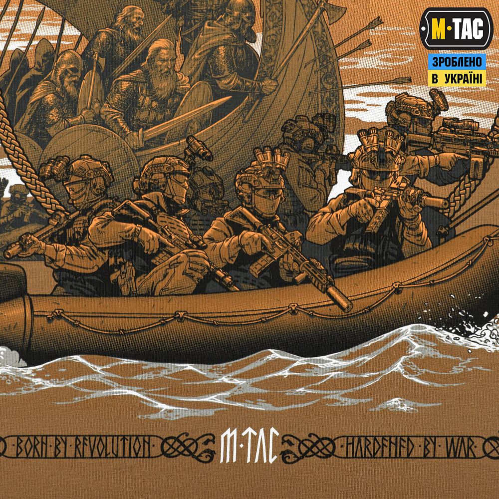 Принт футболки умовно зображує минуле й сьогодення, пов’язане бурхливою течією легендарного шляху. Древні часи відображаються у славнозвісних човнах-драконах, на чолі з безстрашними завойовниками, а сьогодення – у їхніх славетних нащадках, на потужних гумових човнах. Їх розділив час, але не спільне прагнення, яке передається крізь віки. Адже бути воїном – означає жити вічно: у сталій сутності, меті та діях.