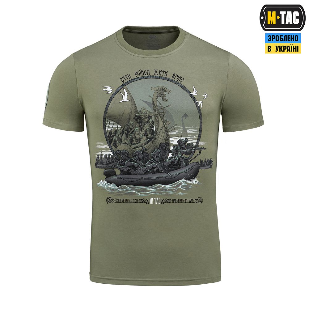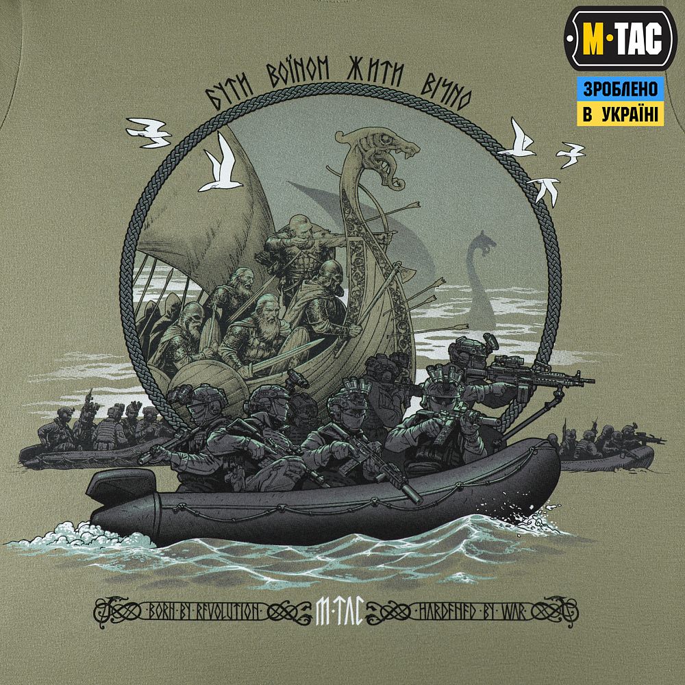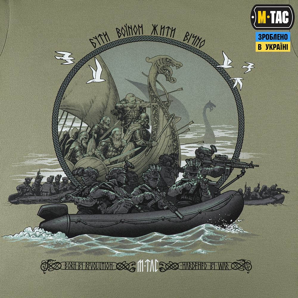 Принт футболки умовно зображує минуле й сьогодення, пов’язане бурхливою течією легендарного шляху. Древні часи відображаються у славнозвісних човнах-драконах, на чолі з безстрашними завойовниками, а сьогодення – у їхніх славетних нащадках, на потужних гумових човнах. Їх розділив час, але не спільне прагнення, яке передається крізь віки. Адже бути воїном – означає жити вічно: у сталій сутності, меті та діях.