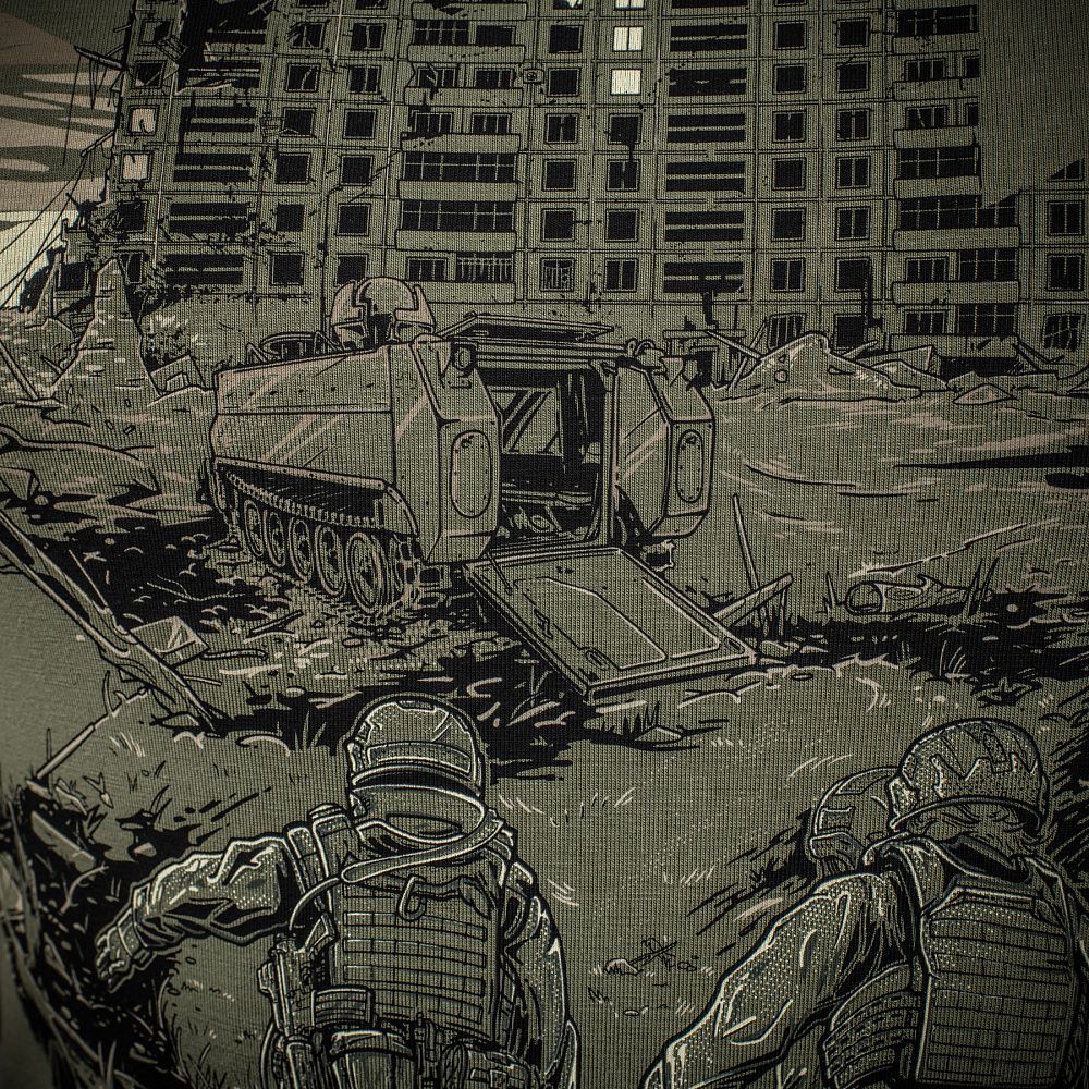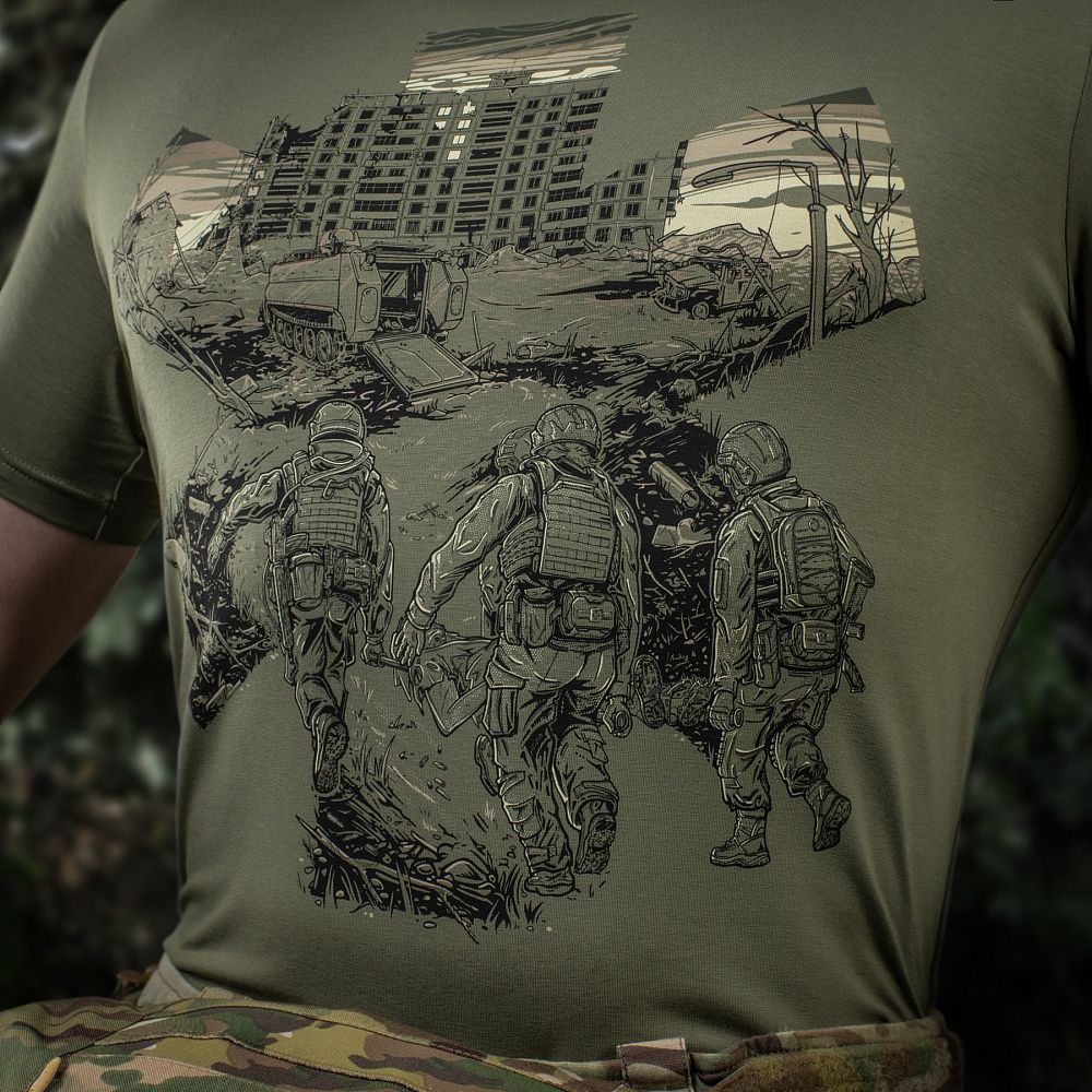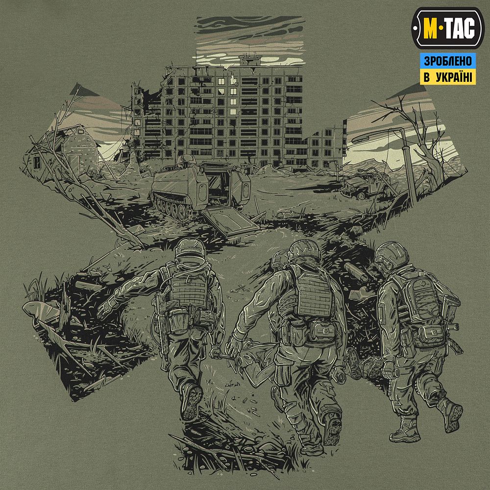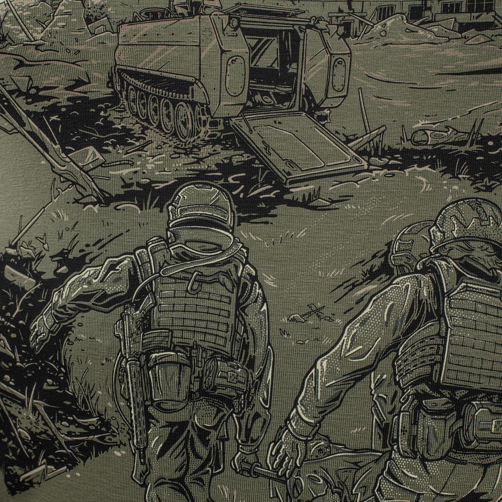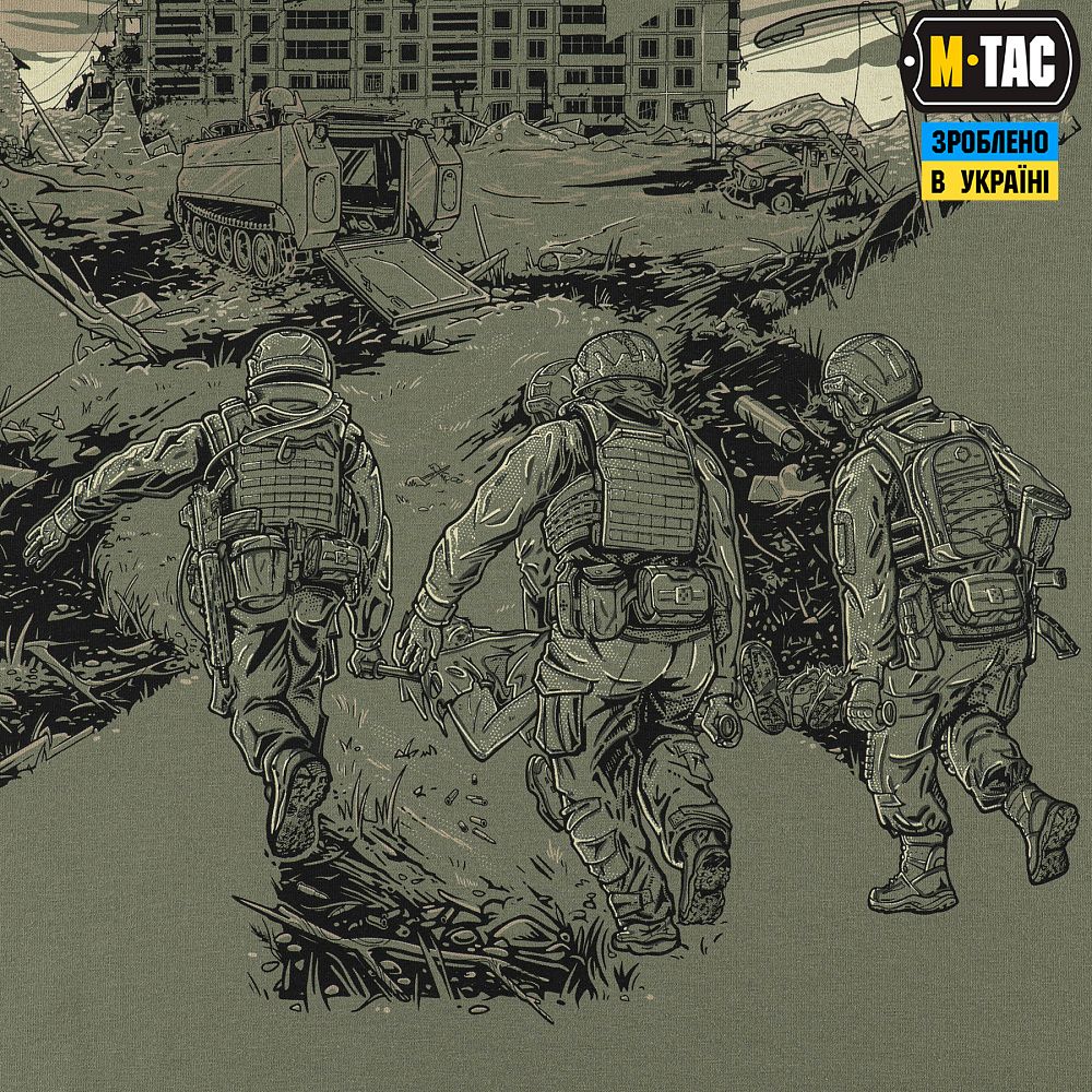 Основою для принта ФУТБОЛКИ EVAC, став епізод з життя бойових медиків. Які і вдень і вночі, у стабпунктах і на полі бою, не покладаючи рук, щоденно рятують життя своїх побратимів, раз за разом посилаючи смерть під три чорти.