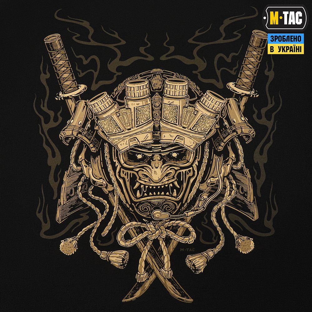 На принті футболки зображений образ самурая, створеного з поєднання минулого й сучасності. Його обличчя покрите бойовою маскою із зображенням Оні – демона, що уособлює жах, хаос та стихійні лиха. Основною задачею цієї частини обладунків – був не лише захист самурая, але й залякування ворогів та символічне наділення воїна силою демона, створюючи ілюзію його непереможності.
