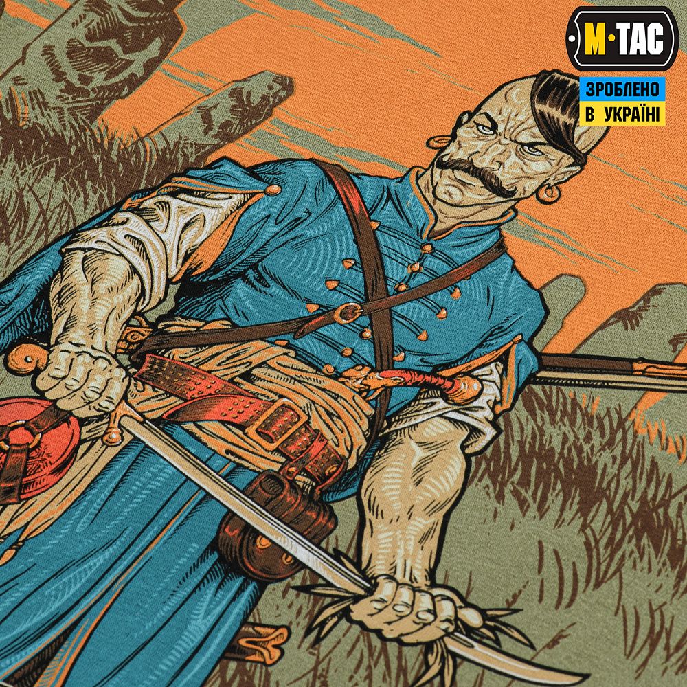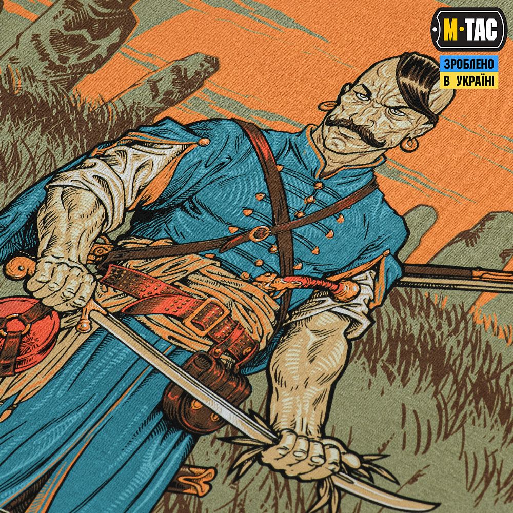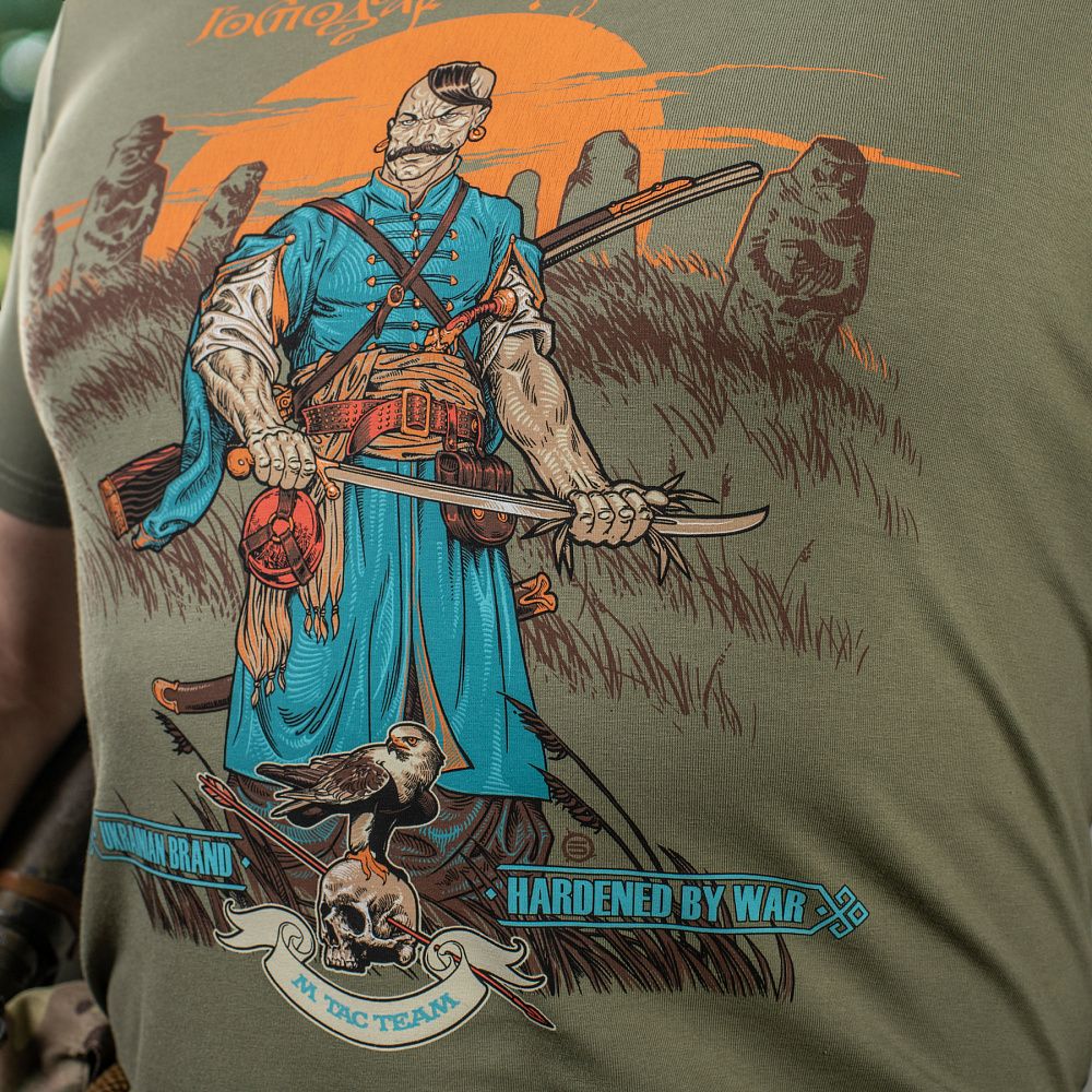 На принті футболки зображений козак, який чистить свою шаблю від ворожої крові травою. Його образ є нагадуванням, що тільки ми є господарями української землі, а хто прийде до нас зі зброєю в руках - від неї і загине. На принті також зображений сокіл, який в слов'янській міфології виступав символом посередництва між світом живих та мертвих. Тож душі всіх знищених окупантів, він буде доставляти в самісіньке пекло. Тло забарвлює схід українського сонця та славнозвісні “половецькі баби” - уособлення багатовікової української історії.