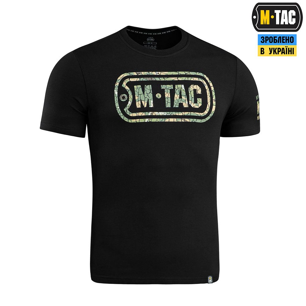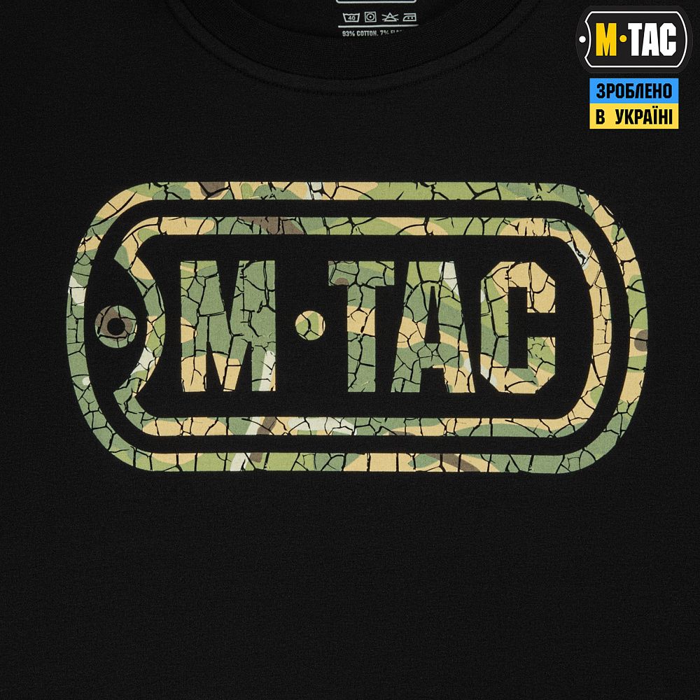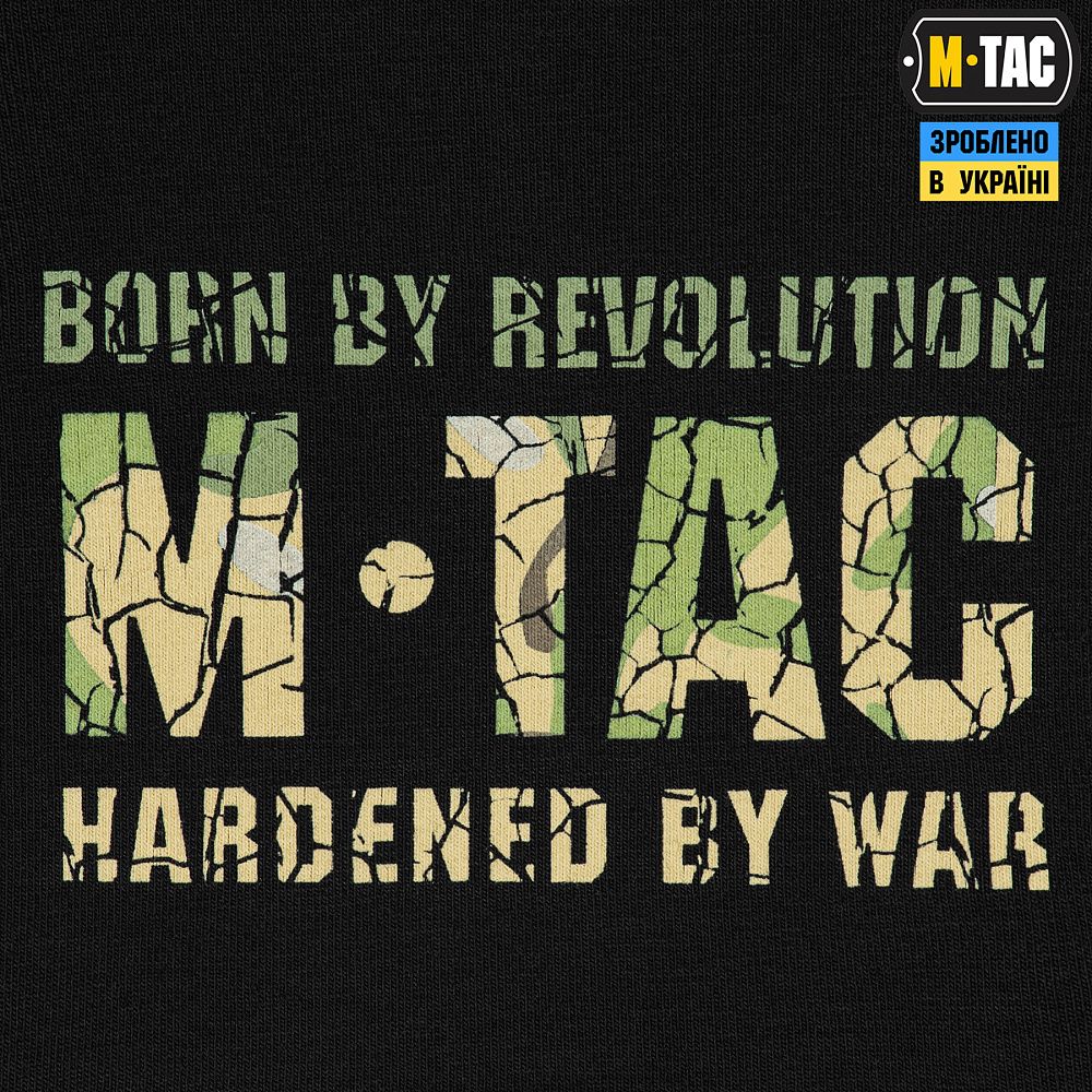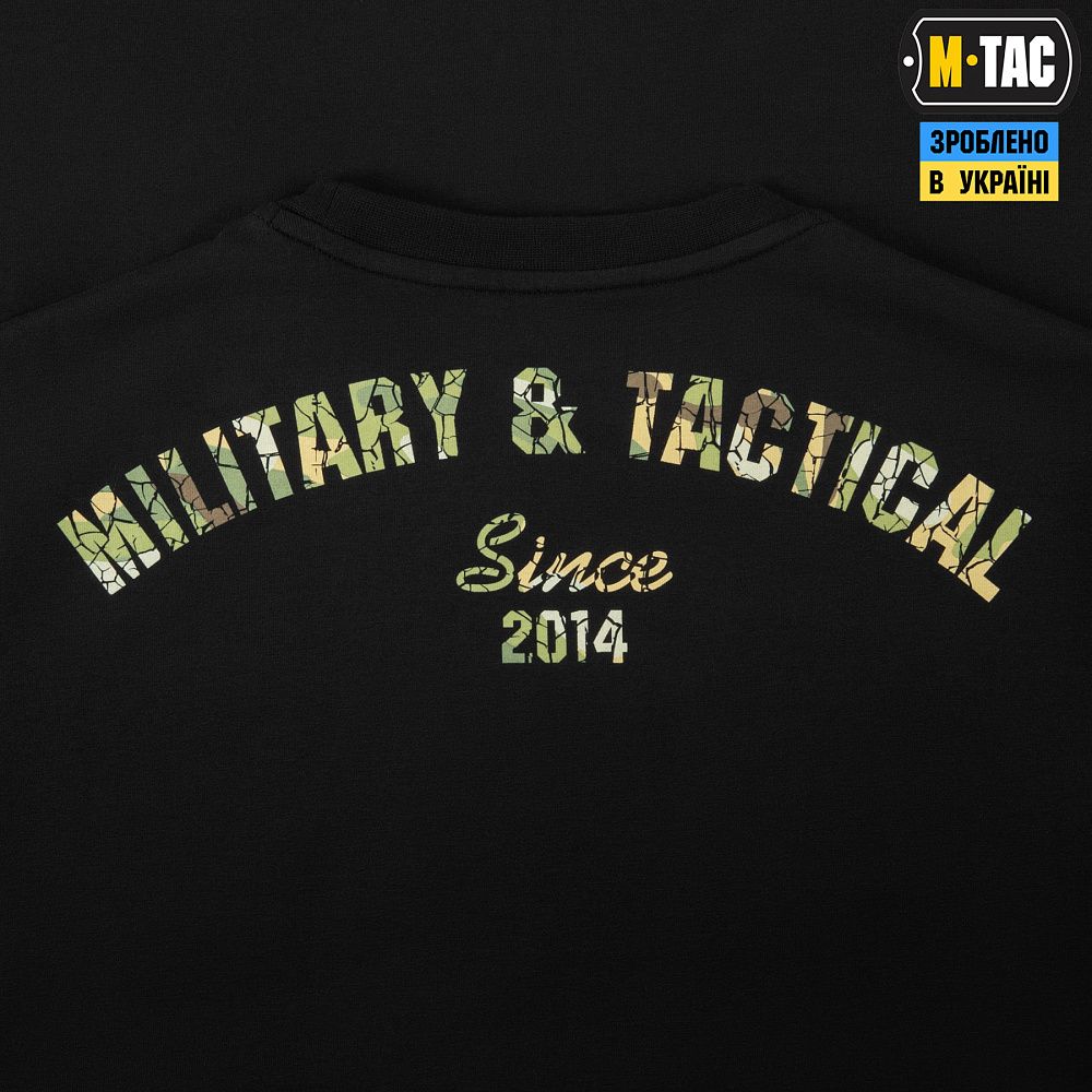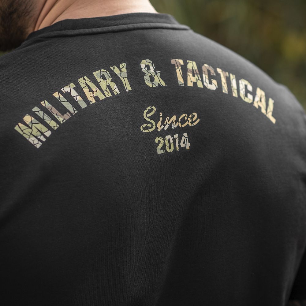 На спині футболки також стилізований камуфляжний напис Military&Tactical Since 2014. Саме під час Революції Гідності народилась ідея створення українського бренду з пошиття та виготовлення тактичного одягу для військових і спецпризначенців. З того часу бренд активно розвивається, а одяг та спорядження від М-Тас вже неодноразово пройшли перевірку найгарячішими військовими конфліктами сьогодення.
