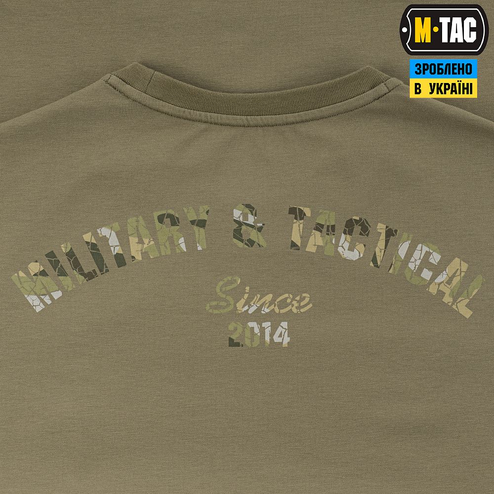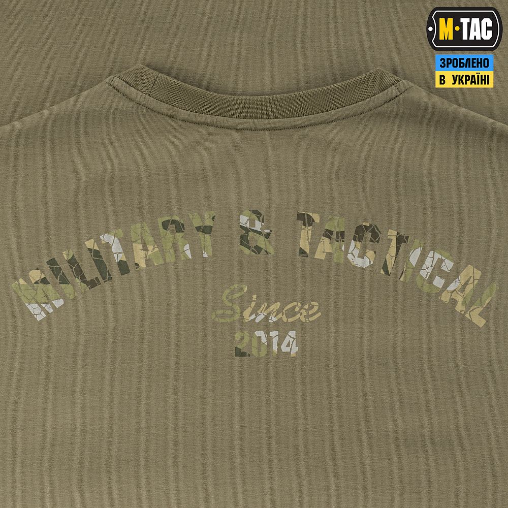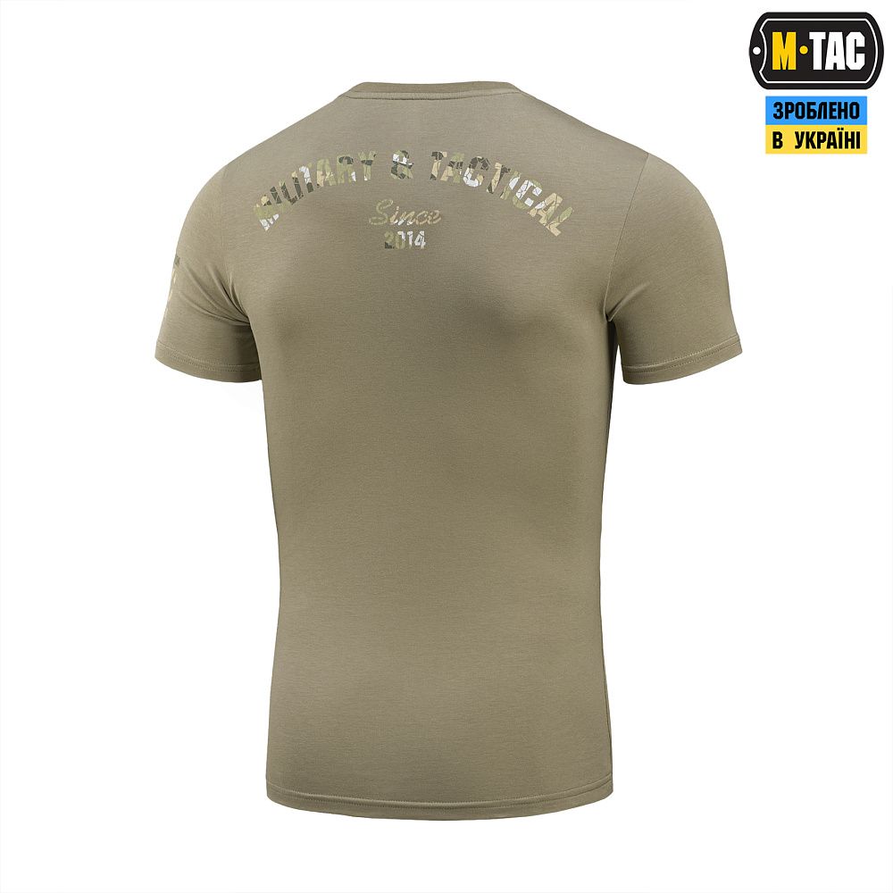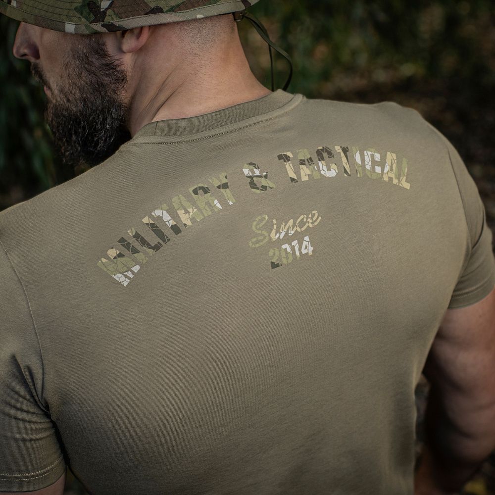 На спині футболки також стилізований камуфляжний напис Military&Tactical Since 2014. Саме під час Революції Гідності народилась ідея створення українського бренду з пошиття та виготовлення тактичного одягу для військових і спецпризначенців. З того часу бренд активно розвивається, а одяг та спорядження від М-Тас вже неодноразово пройшли перевірку найгарячішими військовими конфліктами сьогодення.