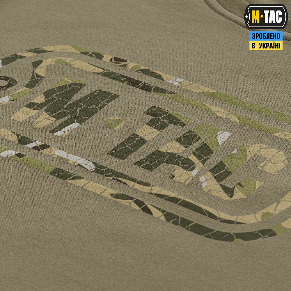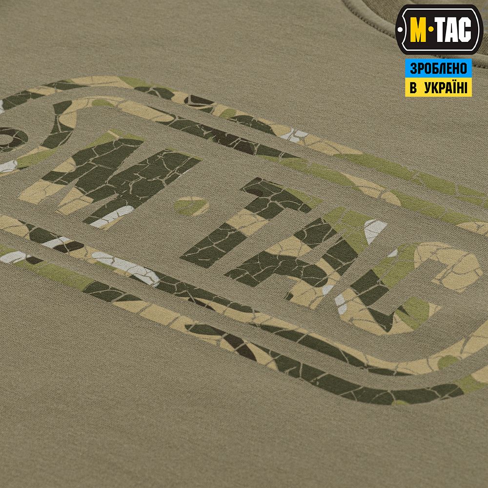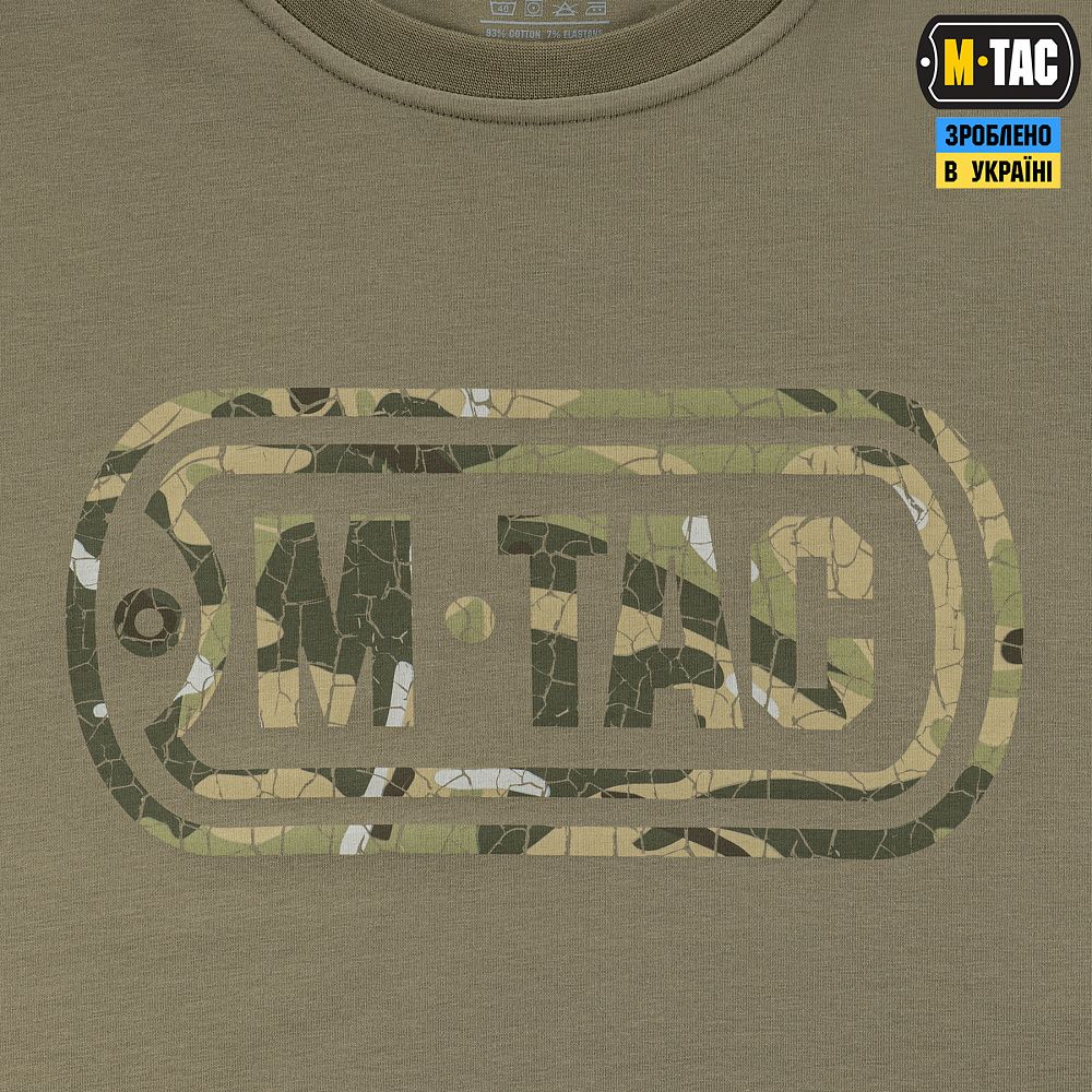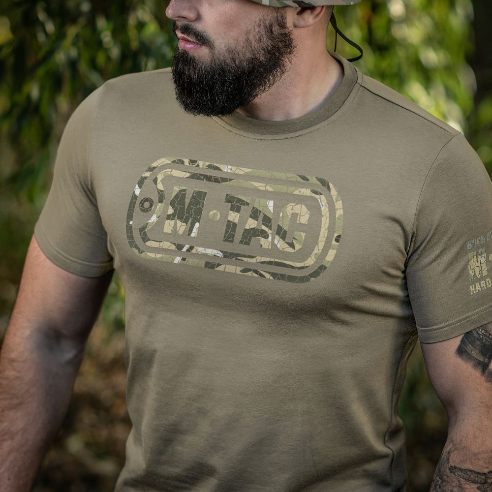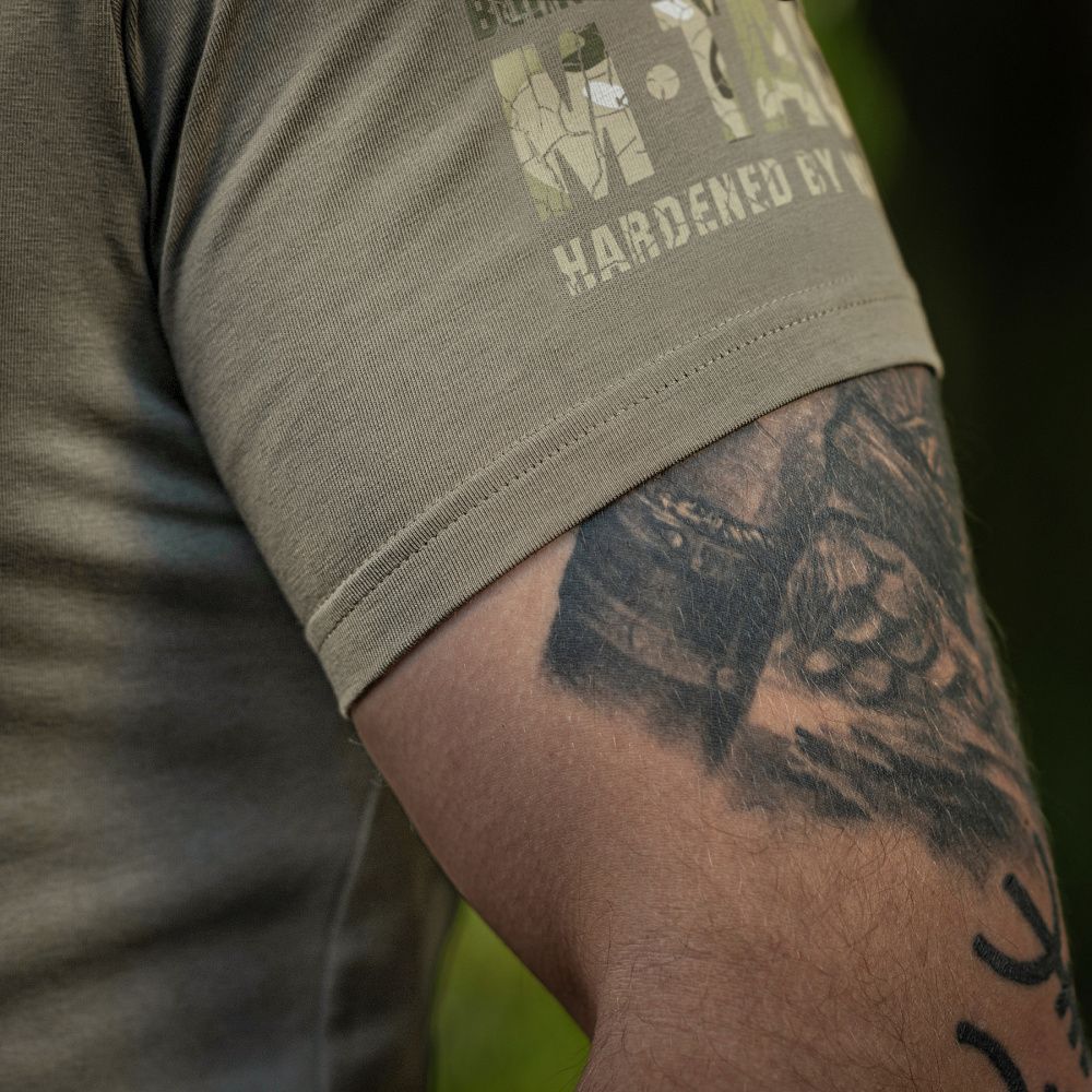 На спині футболки також стилізований камуфляжний напис Military&Tactical Since 2014. Саме під час Революції Гідності народилась ідея створення українського бренду з пошиття та виготовлення тактичного одягу для військових і спецпризначенців. З того часу бренд активно розвивається, а одяг та спорядження від М-Тас вже неодноразово пройшли перевірку найгарячішими військовими конфліктами сьогодення.