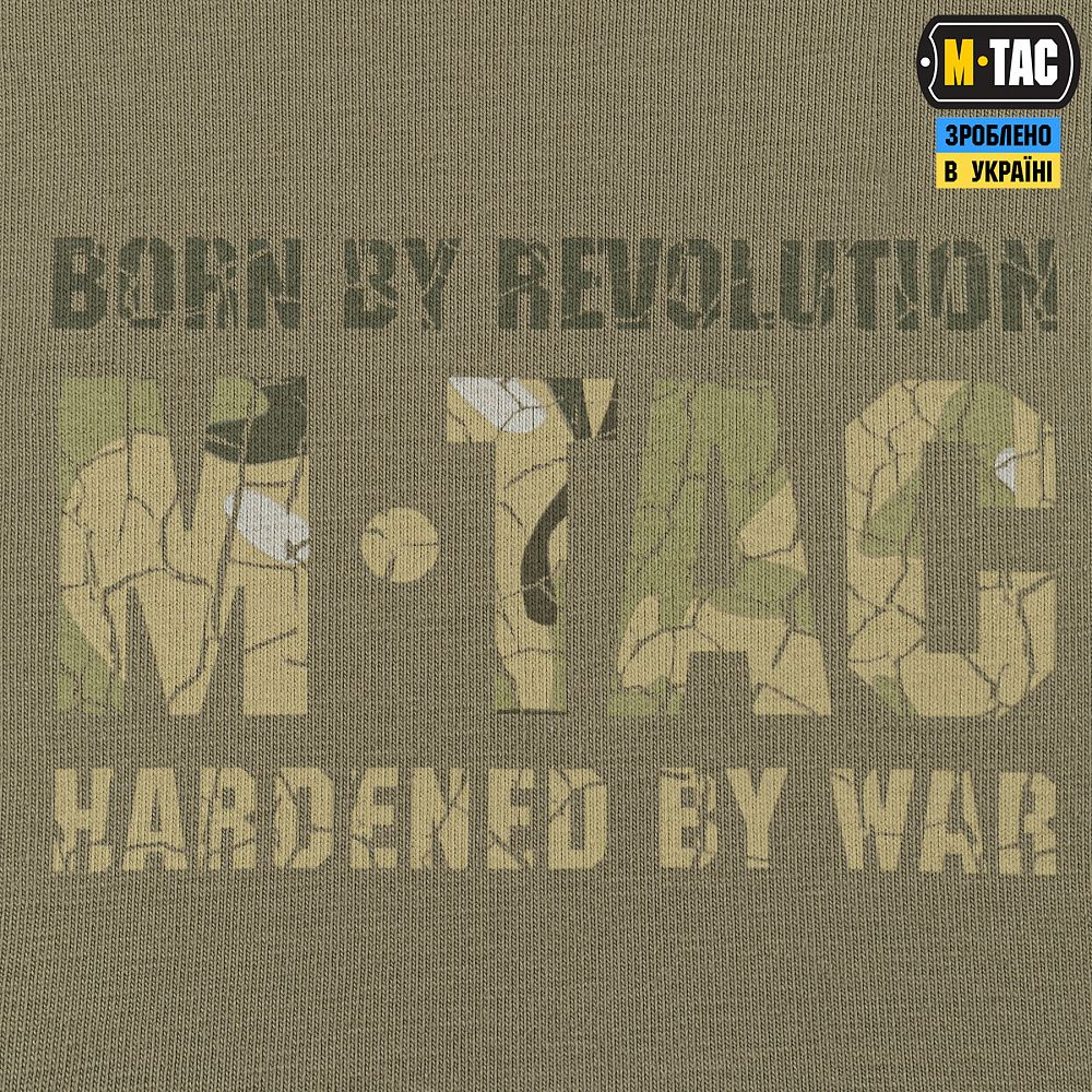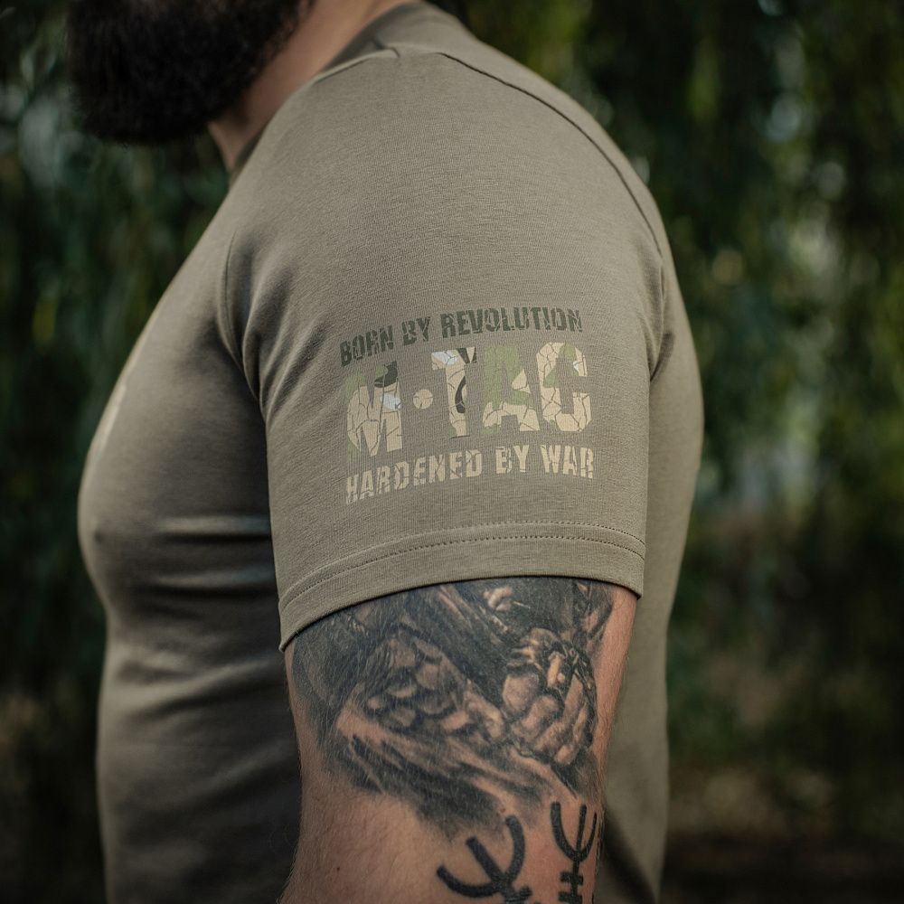 Особливістю даної моделі є стильний камуфляжний принт із зображенням логотипа бренду, що виконаний у фірмовому стилі та створює ефект потрісканості. На рукаві футболки, поруч з логотипом розміщене головне гасло бренду: Born by Revolution – Hardened by War, що в перекладі означає "Народжений революцією – загартований війною".