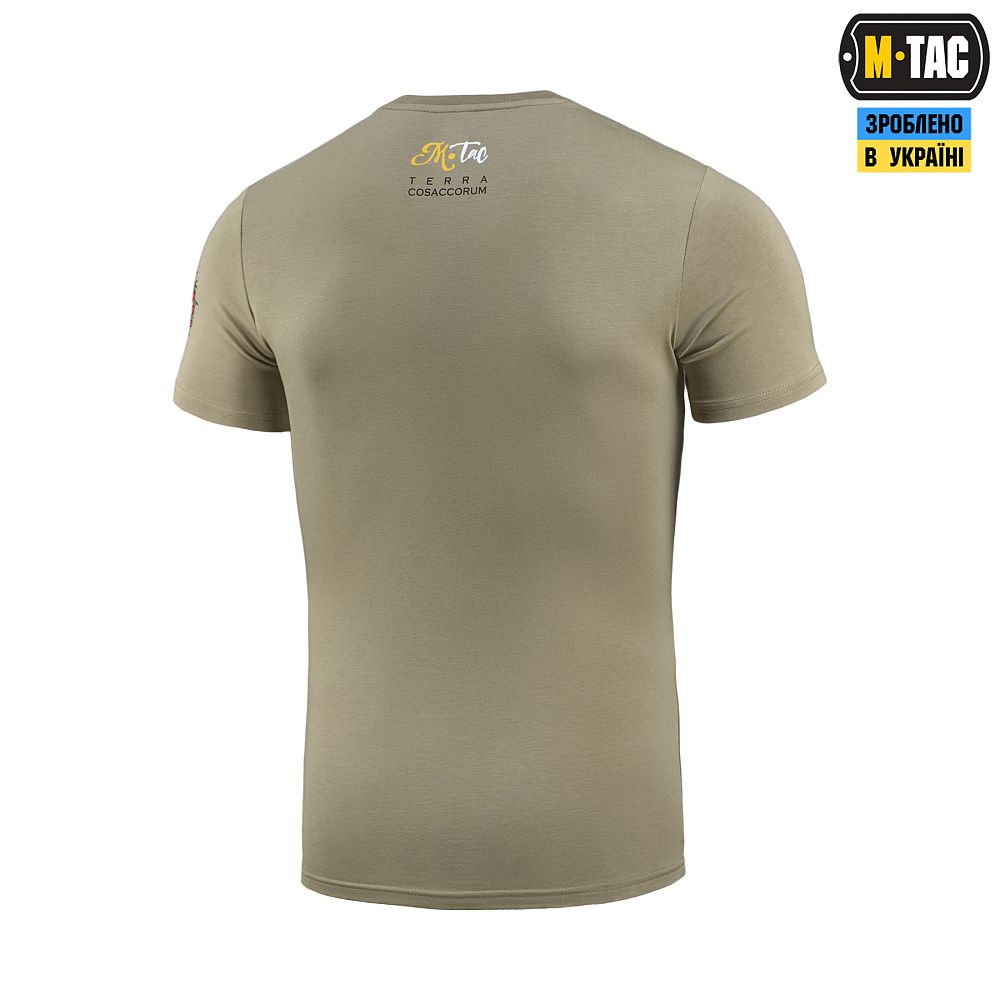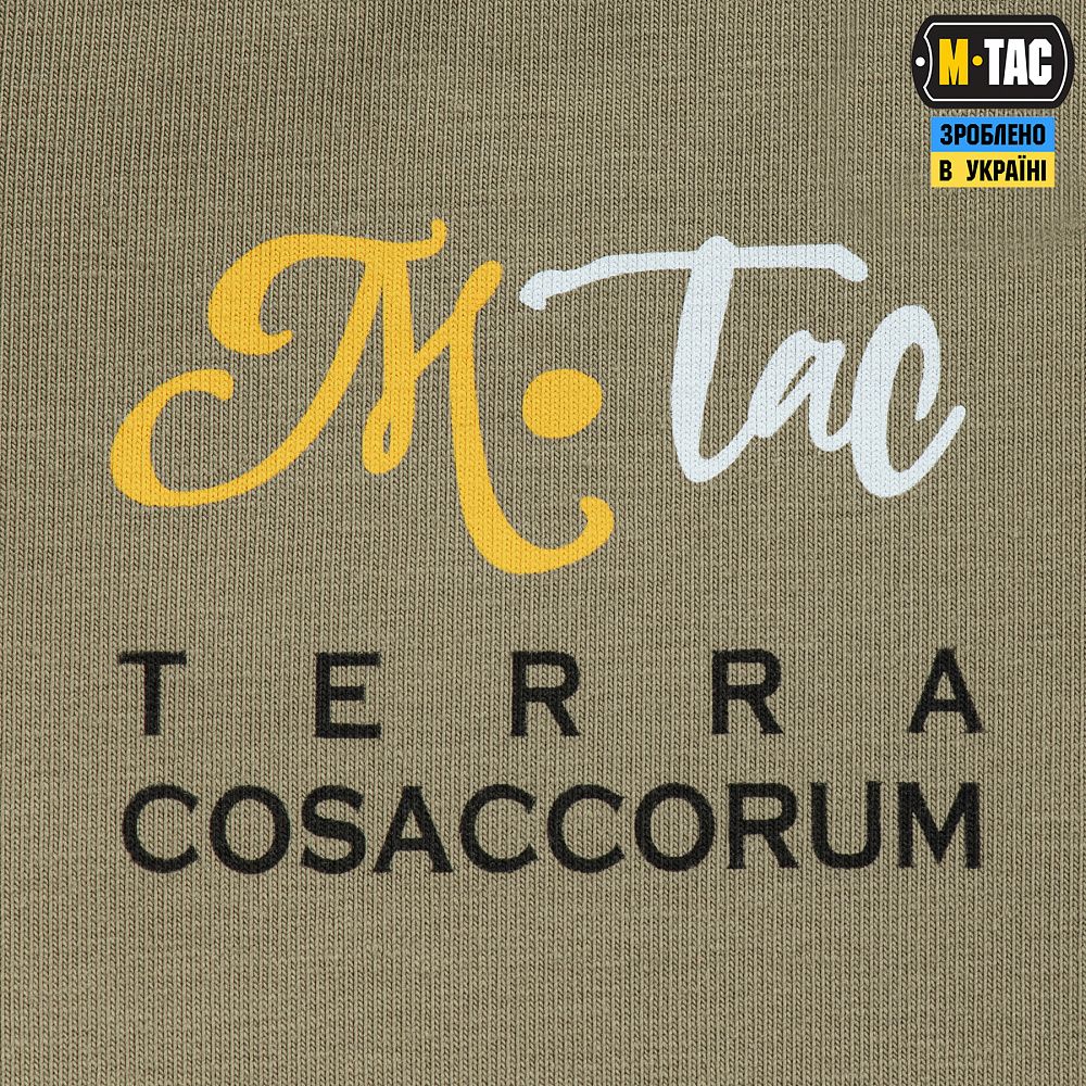 На спині футболки, у верхній частині, розташований напис "M-TAC. Terra Cosaccorum". Terra Cosaccorum (лат. "земля козацька") - латинська назва української землі, поширена колись у Європі.