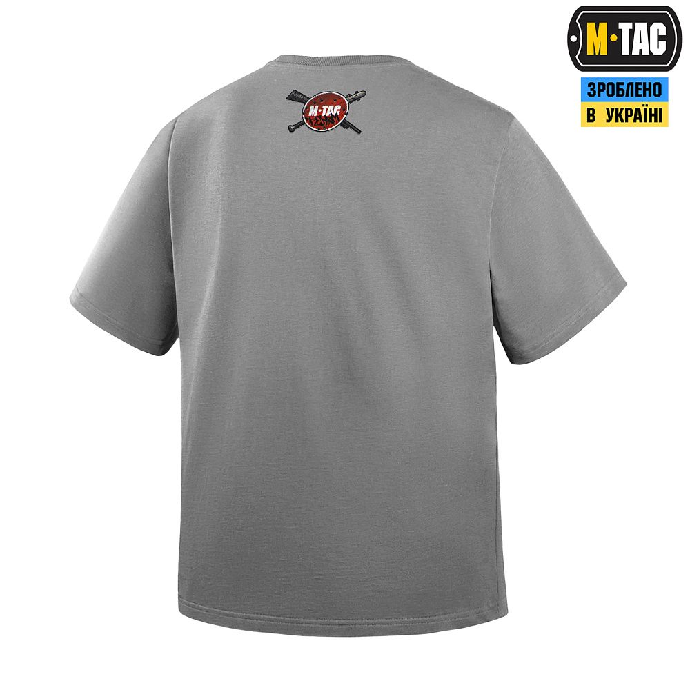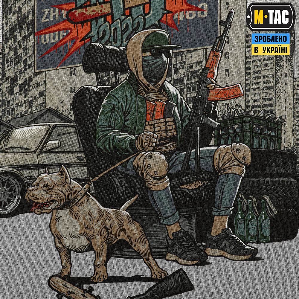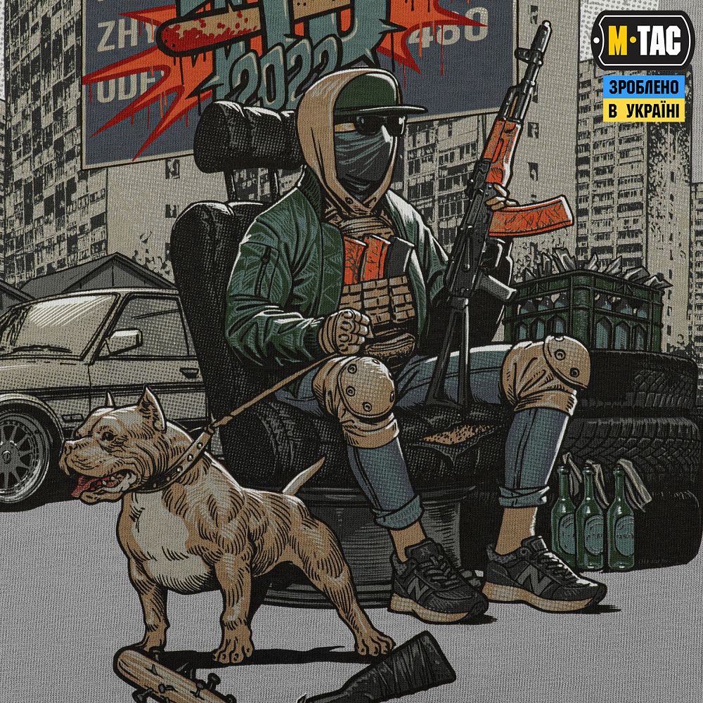Принт футболки відтворює знайомі з дитинства пейзажі, затьмарені барвами війни: рідне місто, “панельки” та вулиці, що вмить стали лінією оборони. Це те, що є початком історій тисяч добровольців, які обрали для себе шлях воїна, маючи за плечами лише відвагу та віру у майбутнє України.