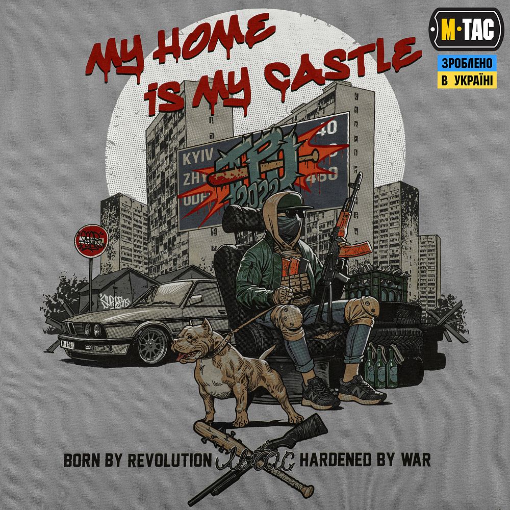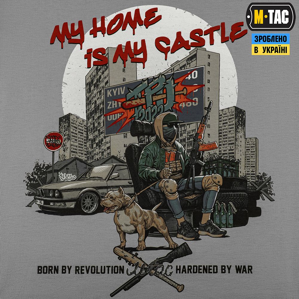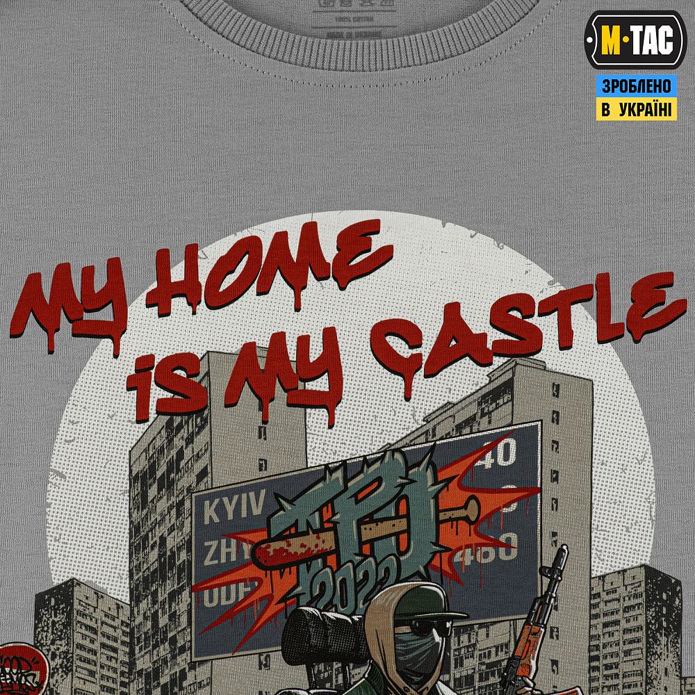 Футболка My Home is my Castle (з англ. Мій дім - моя фортеця) – це вшанування вкладу тих, хто без остраху став проти регулярної армії ворога, поставив звичне життя на паузу, поповнивши лави Сил оборони, та й досі зухвало чинить спротив на окупованих територіях, борючись за найцінніше - рідний дім.