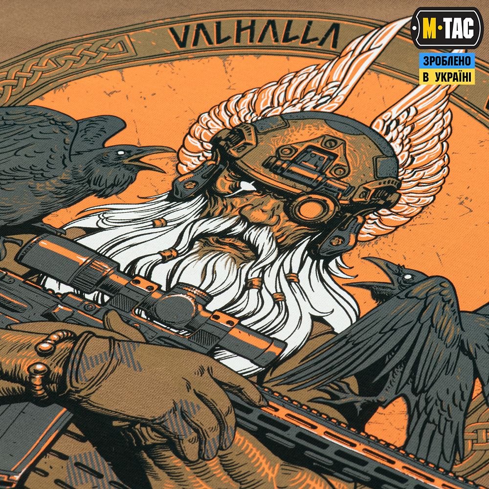 На принті зображений рішуче налаштований Одін, який змінив свій традиційний спис (Гунгнір) на гвинтівку AR-15. У сучасному бойовому спорядженні та в шоломі з ПНБ він готовий вести своїх воїнів в останню битву. На плечі Одіна сидять його вірні супутники – ворони Хугін (думки) і Мунін (пам’ять), які щодня облітають 9 світів і повідомляють верховному богу про все, що відбулося.