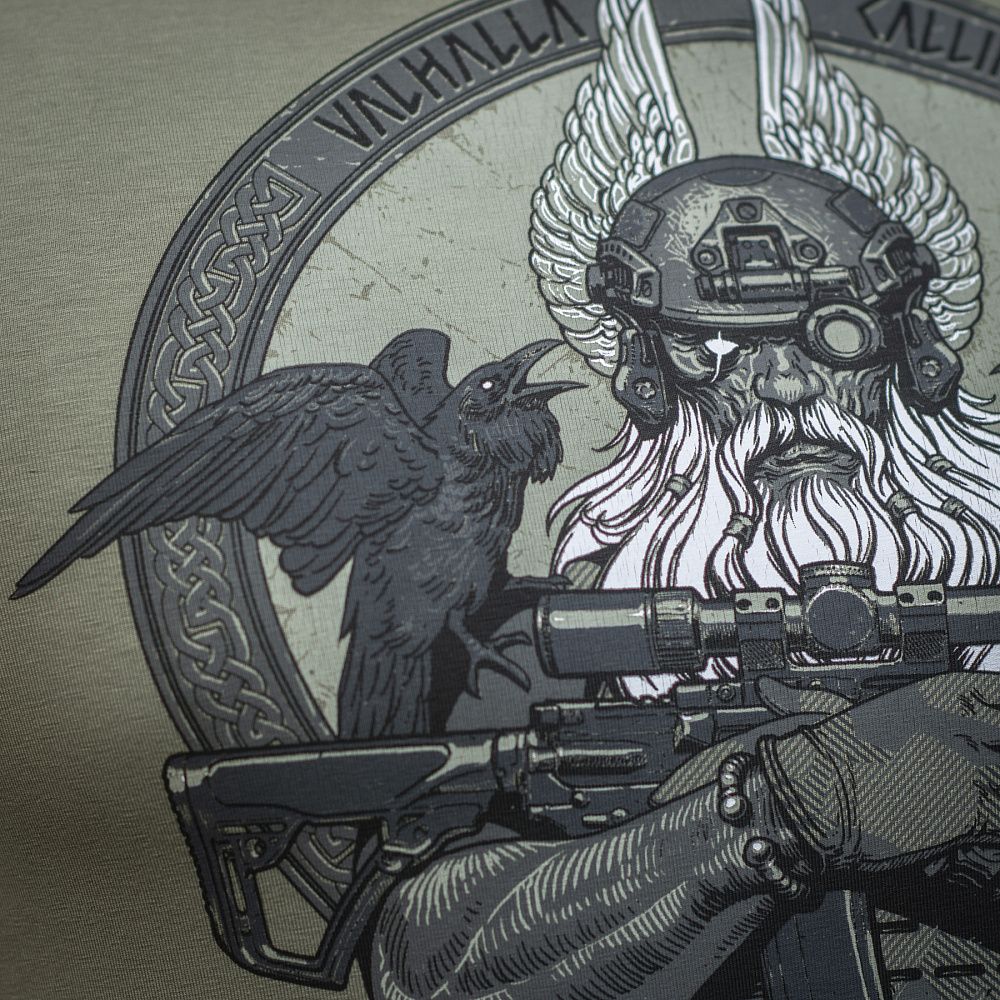 На принті зображений рішуче налаштований Одін, який змінив свій традиційний спис (Гунгнір) на гвинтівку AR-15. У сучасному бойовому спорядженні та в шоломі з ПНБ він готовий вести своїх воїнів в останню битву. На плечі Одіна сидять його вірні супутники – ворони Хугін (думки) і Мунін (пам’ять), які щодня облітають 9 світів і повідомляють верховному богу про все, що відбулося.