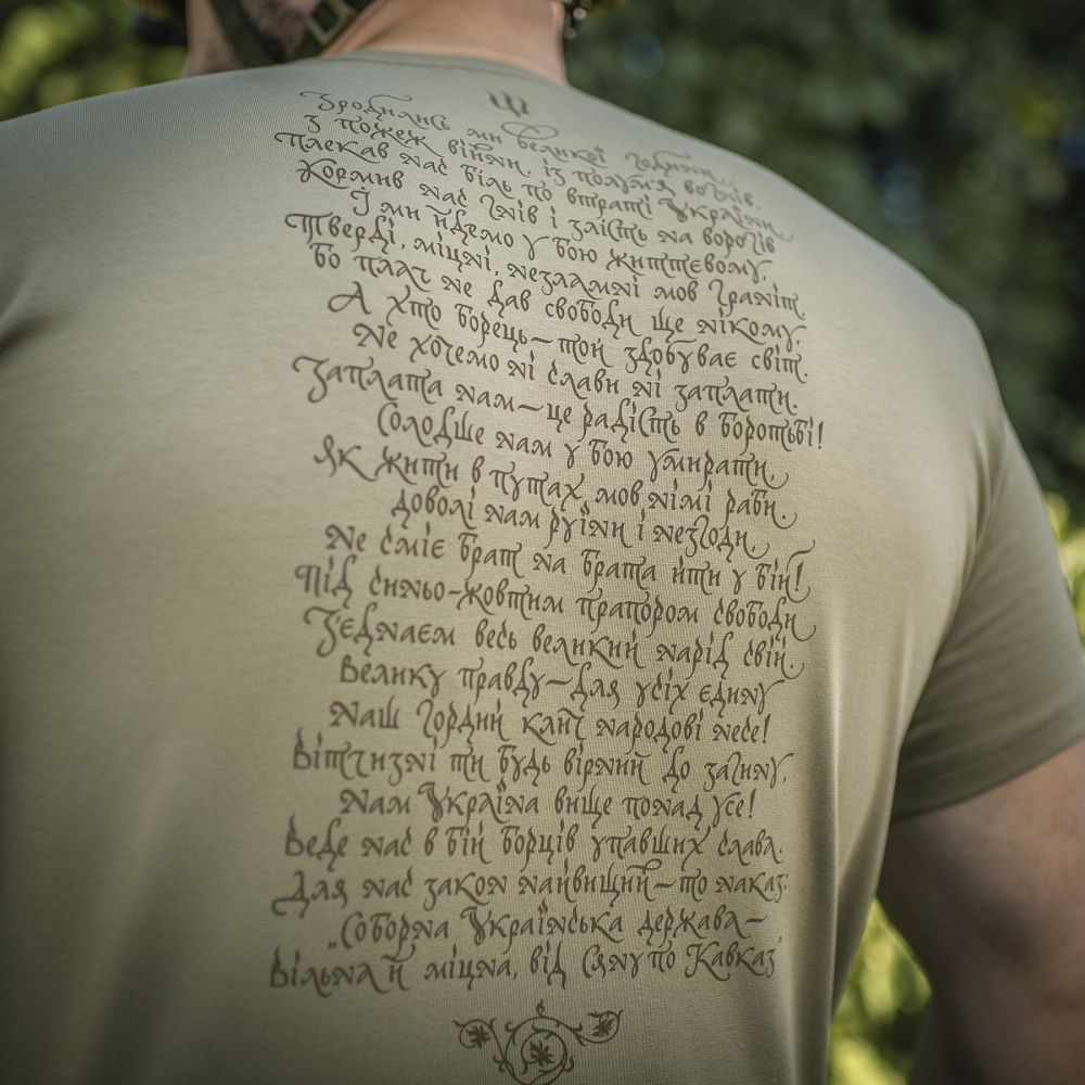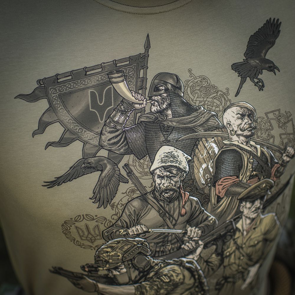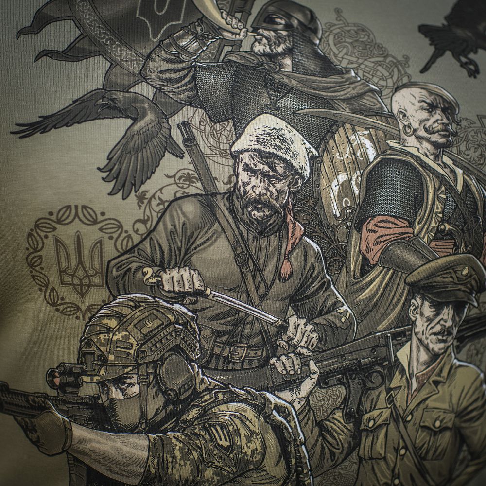 На принті зображені різні покоління українських воїнів, об'єднані однією метою - боротьбою за незалежність України. На спині футболки розміщений текст «Маршу Українських Націоналістів», гімну ОУН, який протягом багатьох років є символом українського визвольного духу.