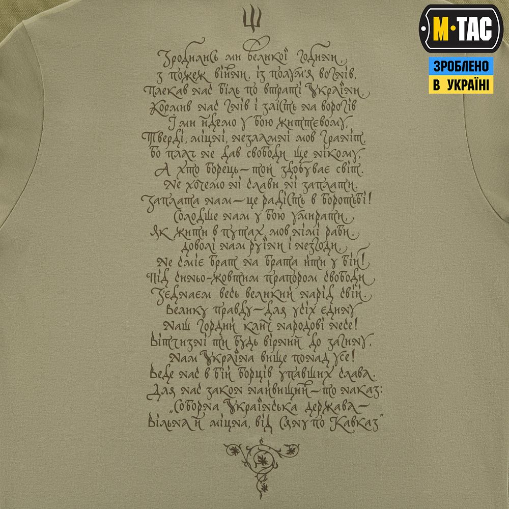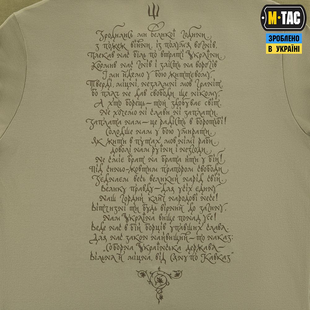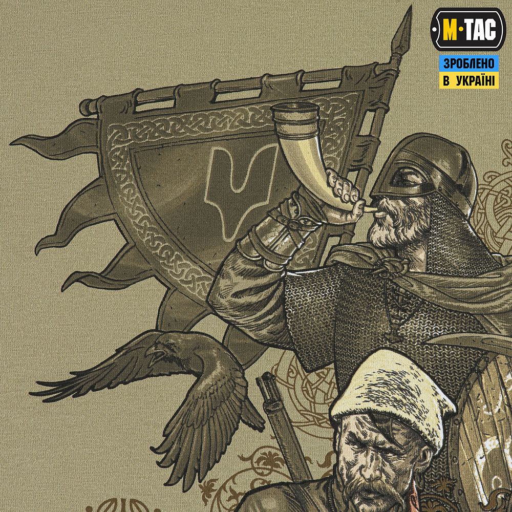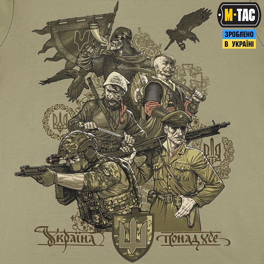 На принті зображені різні покоління українських воїнів, об'єднані однією метою - боротьбою за незалежність України. На спині футболки розміщений текст «Маршу Українських Націоналістів», гімну ОУН, який протягом багатьох років є символом українського визвольного духу.