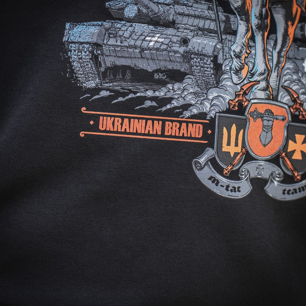 Знизу принта розміщені загальновійськовий тризуб, емблема танкових військ та Збройних сил України, підкреслюючи єдність та міць сил оборони країни.