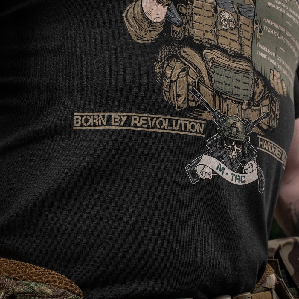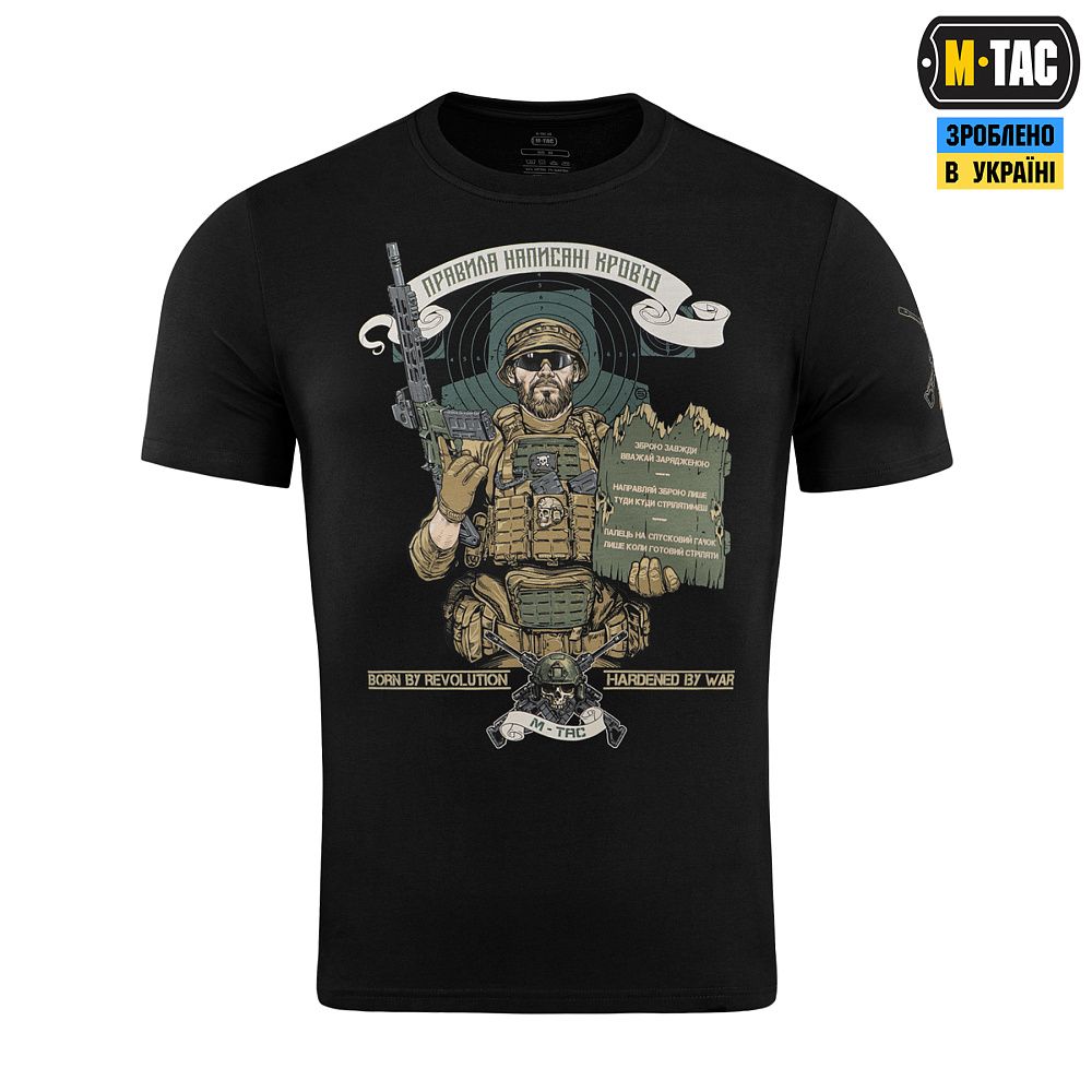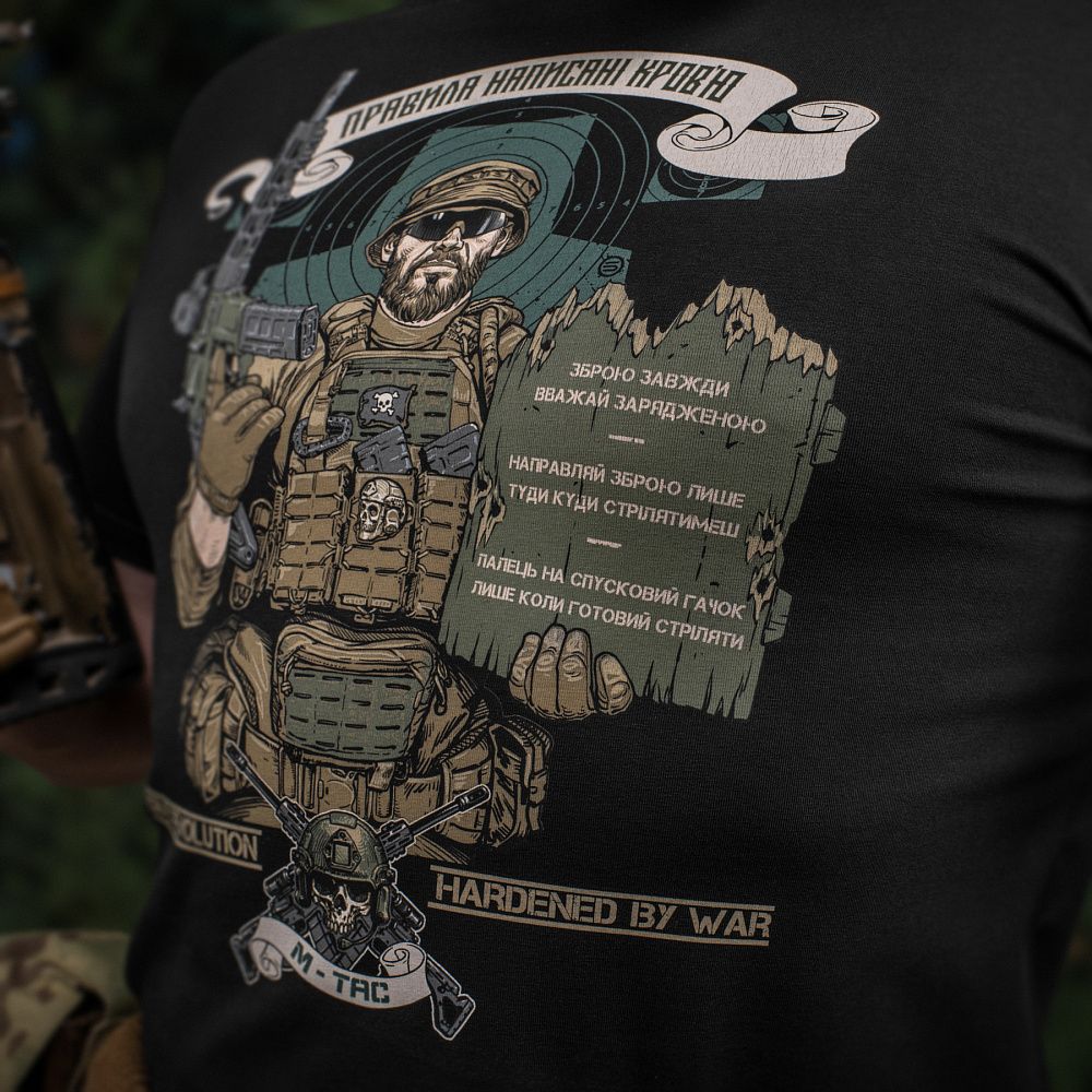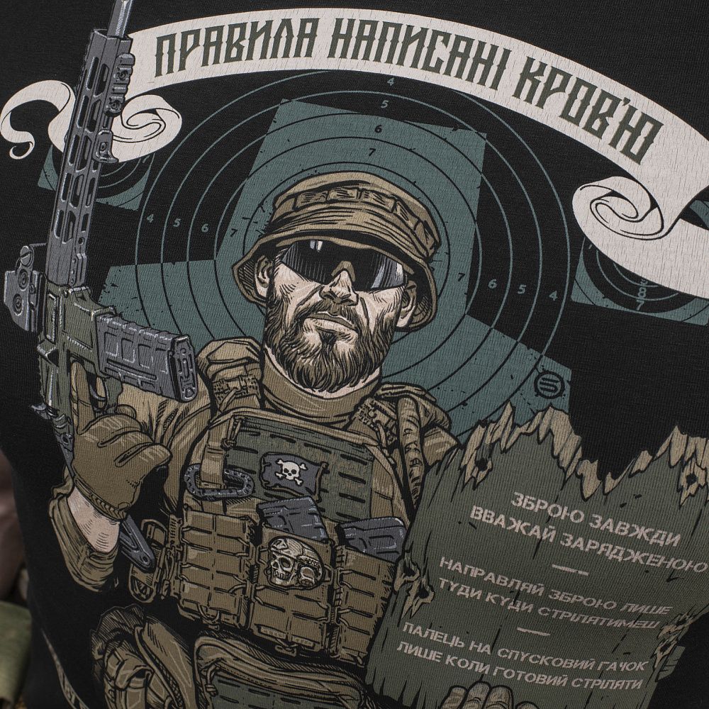 На принті зображений військовий - професіонал своєї справи. В одній руці він тримає гвинтівку типу AR-15, а в іншій - понівечену часом та військовими діями табличку, з висіченими заповідями стрільця. З плином часу, ці написані кров’ю правила залишаються незмінними, адже тільки за їх дотримання, ви зможете гарантувати безпеку для себе та оточуючих.